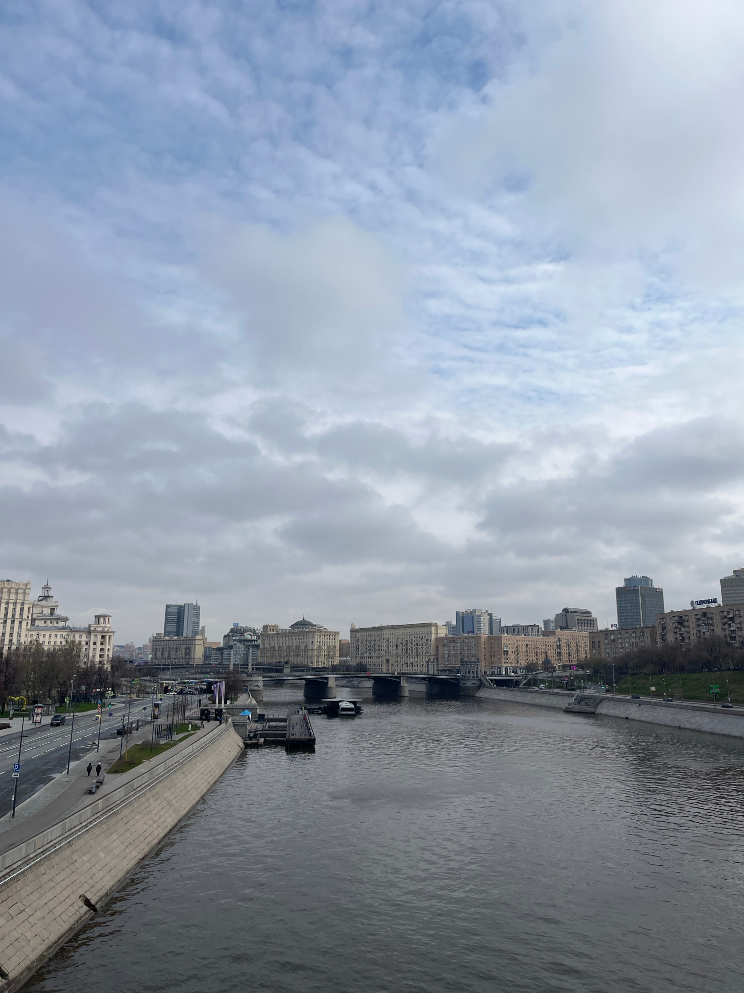 The image depicts a cityscape in Moscow, Russia, along the Moskva River. The river is on the right side of the image, showing its concrete embankment and the water's surface. A multi-lane road runs pa…read more