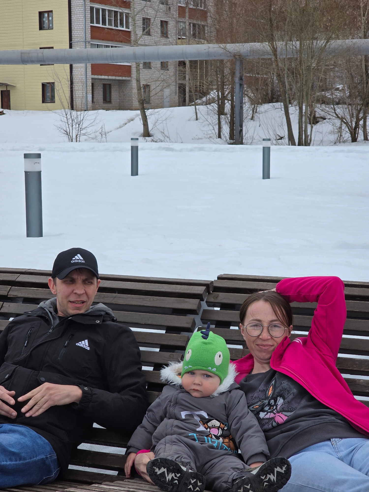 A family is sitting on a wooden bench in what appears to be the city of Votkinsk, Russia. Snow covers the ground around the bench and is visible in the background. A man, wearing a black Adidas jacket…read more