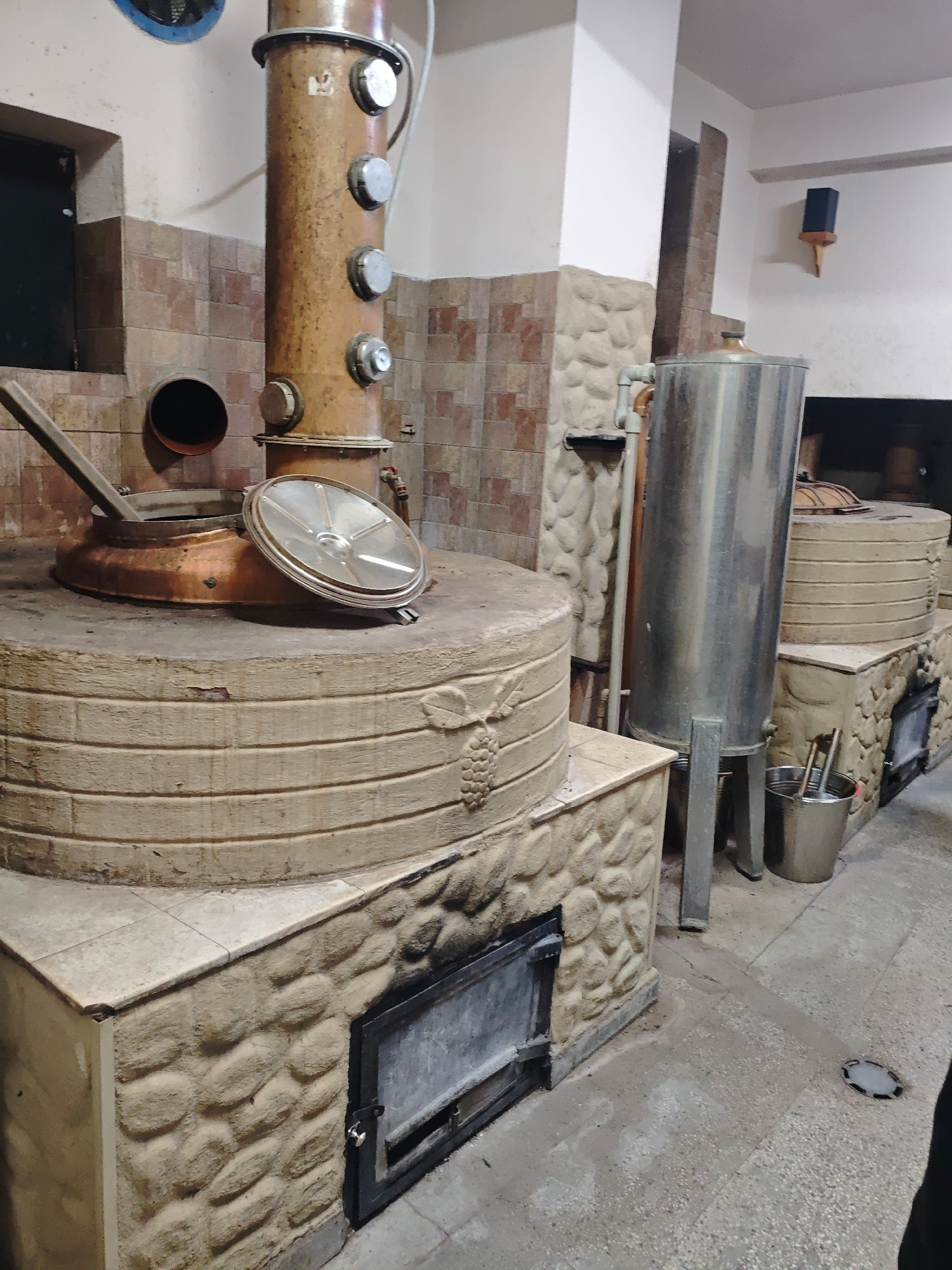 The image captures the interior of a distillery. The scene is dominated by a large, cylindrical, copper still, which is the primary piece of equipment for distilling spirits. This still is seated atop…read more