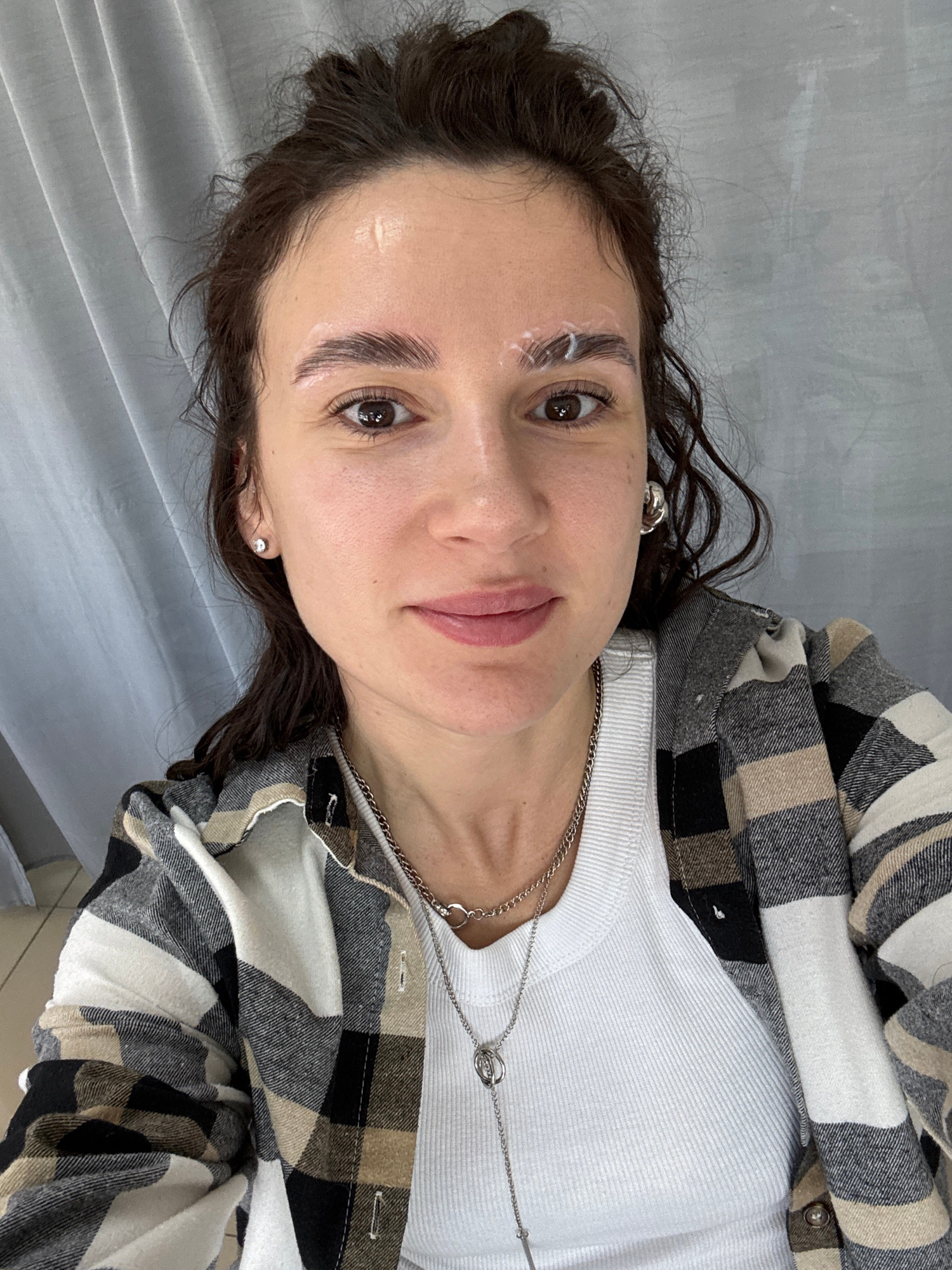 A young woman is depicted in a close-up portrait, lying down and looking directly at the camera with a neutral to slightly smiling expression. She has dark, wavy hair, brown eyes, and fair skin. A no…read more