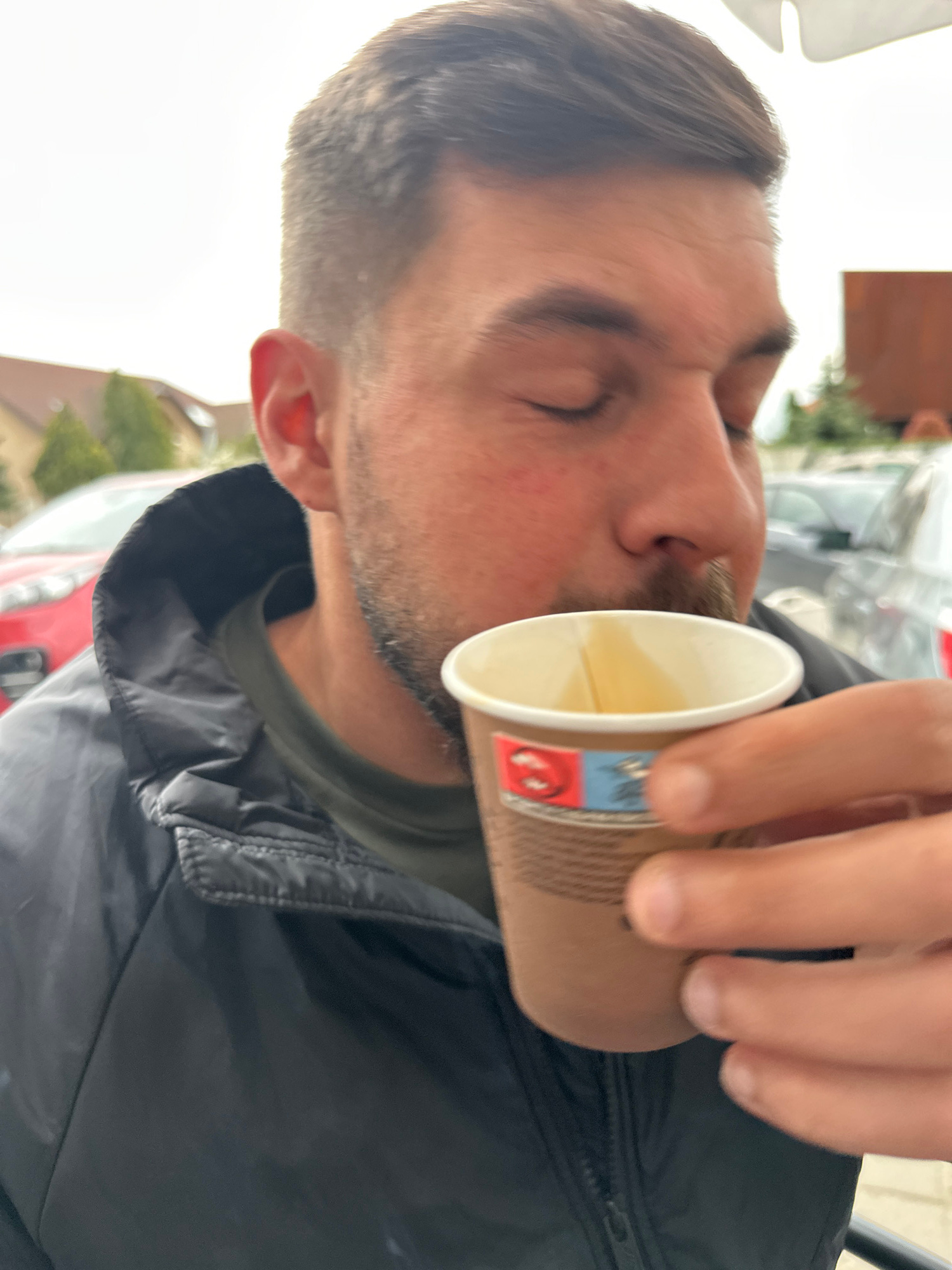 The image shows a close-up, profile view of a man drinking from a disposable paper cup in an outdoor setting in Plovdiv, Bulgaria. The man, seen from the mid-chest up, faces left with his eyes closed. He has short brown hair and light stubble or a short beard, and is wearing a dark green t-shirt under a black zip-up jacket. His right hand holds a brown paper cup with a white rim, containing a light yellow liquid, possibly tea or juice. The cup features a small, colored design on its side with blue and red sections, though no clear text or detailed logos are discernible. The background is blurred, suggesting an outdoor environment during daytime. Vague shapes of vehicles, including a red car, and some greenery are visible in the soft-focus background, alongside a bright, possibly overcast sky or light-colored building facade. The man's closed eyes might convey concentration or enjoyment while he takes a sip from the cup. | Open Wire