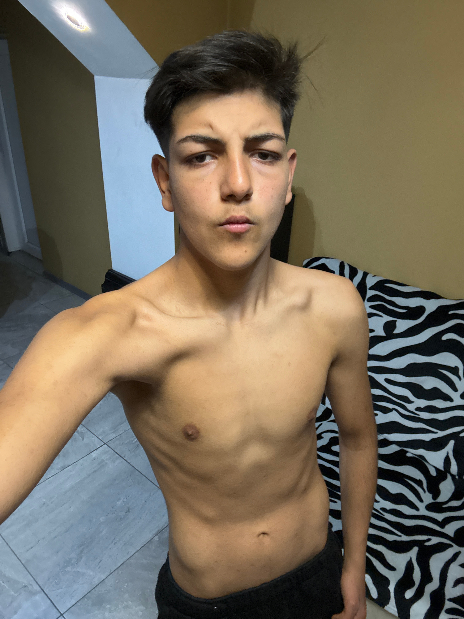 A shirtless young man with short dark hair is shown from the chest up. He is wearing dark shorts. He is indoors, with a zebra-striped fabric behind him. The background also includes a wall that is a l…read more