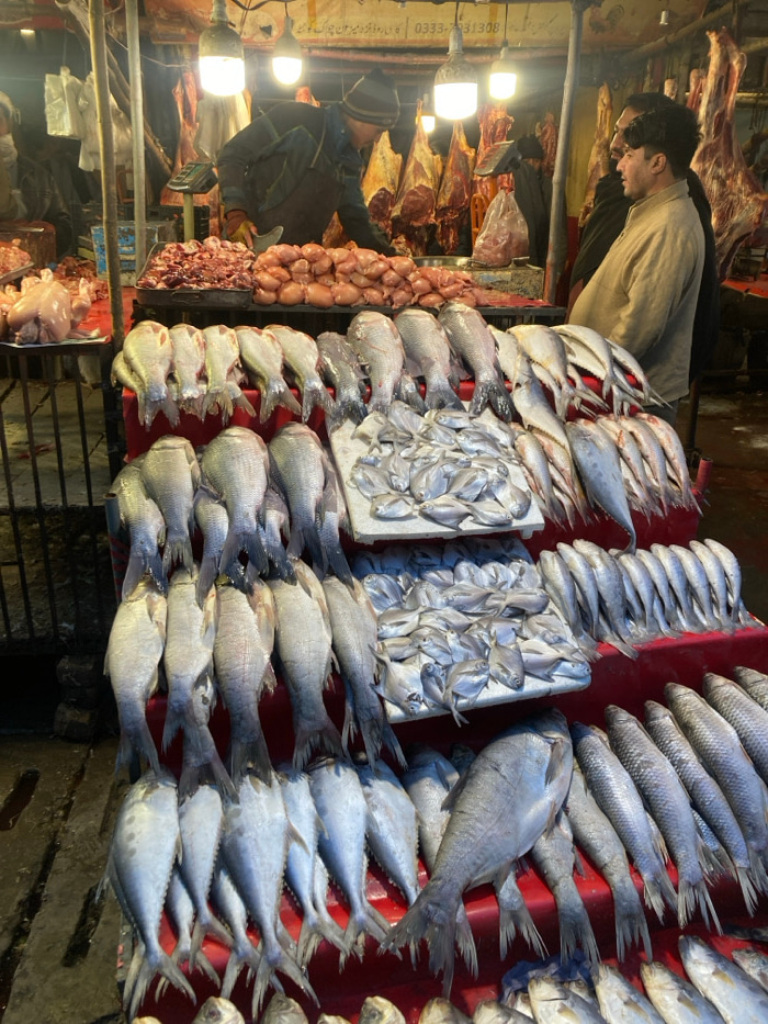 A busy market scene displays rows of fresh fish in various sizes, arranged on a red surface. Alongside the fish, there are cuts of meat and chicken, some hanging and others displayed. Two individuals…read more