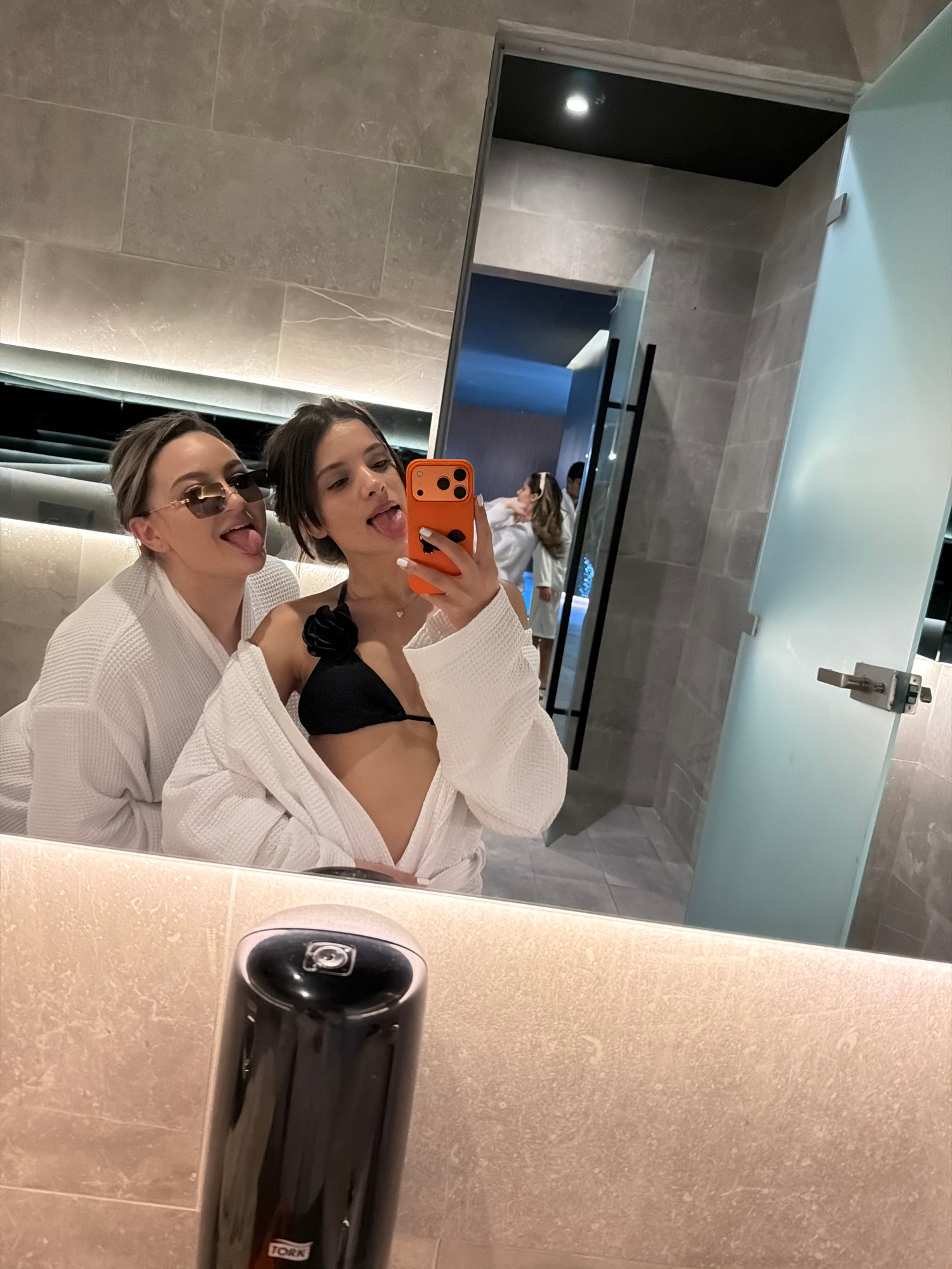 Two women in white bathrobes and swimwear are reflected in a bathroom mirror. One woman wears sunglasses and has her tongue out. The other woman also has her tongue out and is holding an orange smartp…read more