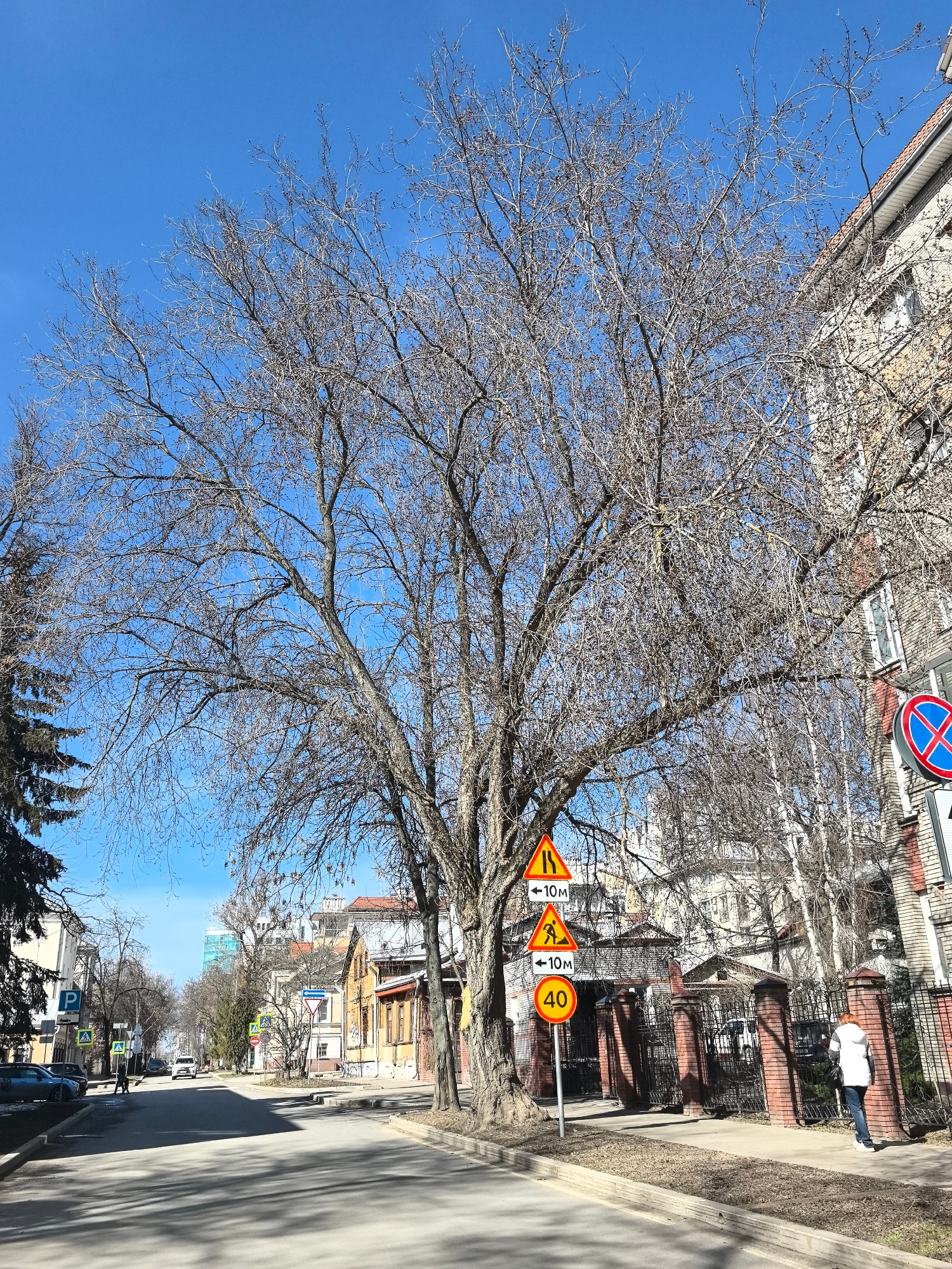 A street scene in Nizhny Novgorod, Russia, presents a view of residential architecture under a clear, bright blue sky. A large, leafless tree dominates the right side of the frame, its bare branches s…read more