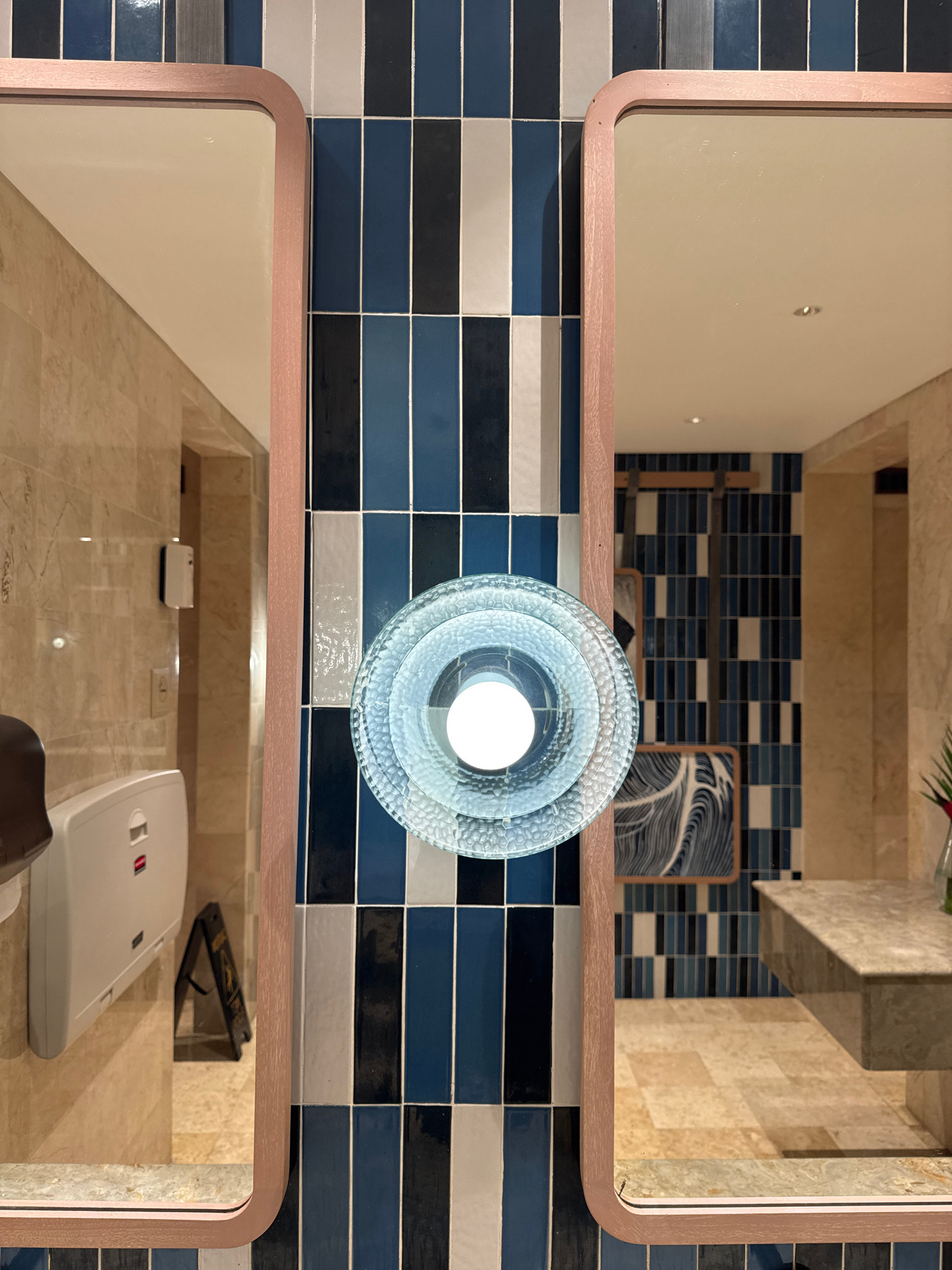 The image shows a bathroom with two vertically stacked mirrors against a blue-toned, horizontally tiled wall. A circular, textured light fixture hangs between the mirrors. The top mirror reflects a po…read more