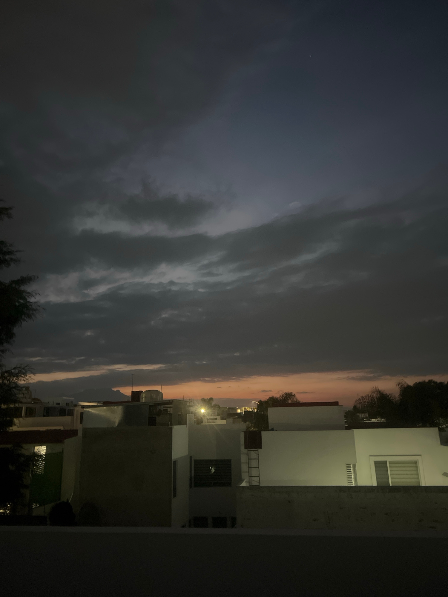 The image captures a residential scene in Cholula, Mexico, at dusk or early night. The sky occupies a significant portion of the frame, displaying a gradient from a dark, cloudy grey-blue directly ove…read more