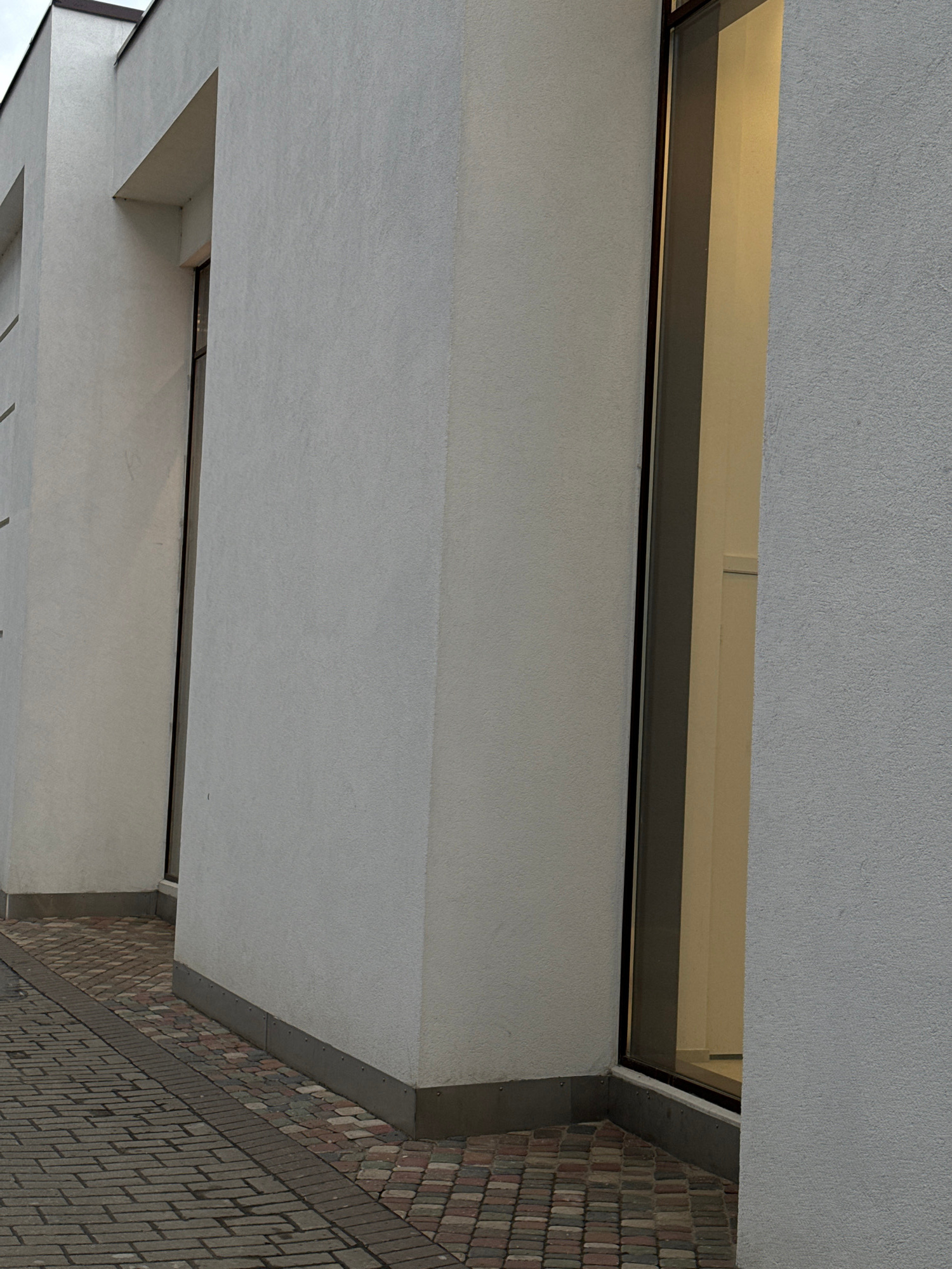 The image captures an upward-looking view of modern building architecture, dominated by light gray concrete structures, a window band, and a textured brick wall. Large, textured light gray concrete s…read more