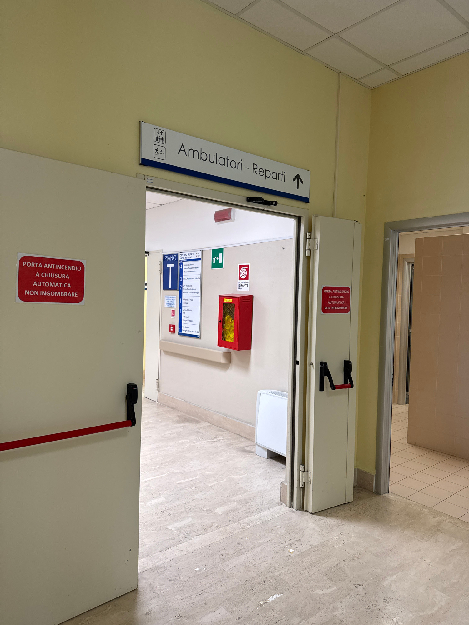 The image shows a hallway in the Ospedali Riuniti Anzio-Nettuno in Anzio, Italy. The hallway has pale yellow walls and a light-colored stone floor. A sign on the wall indicates "Ambulatori - Reparti"…read more