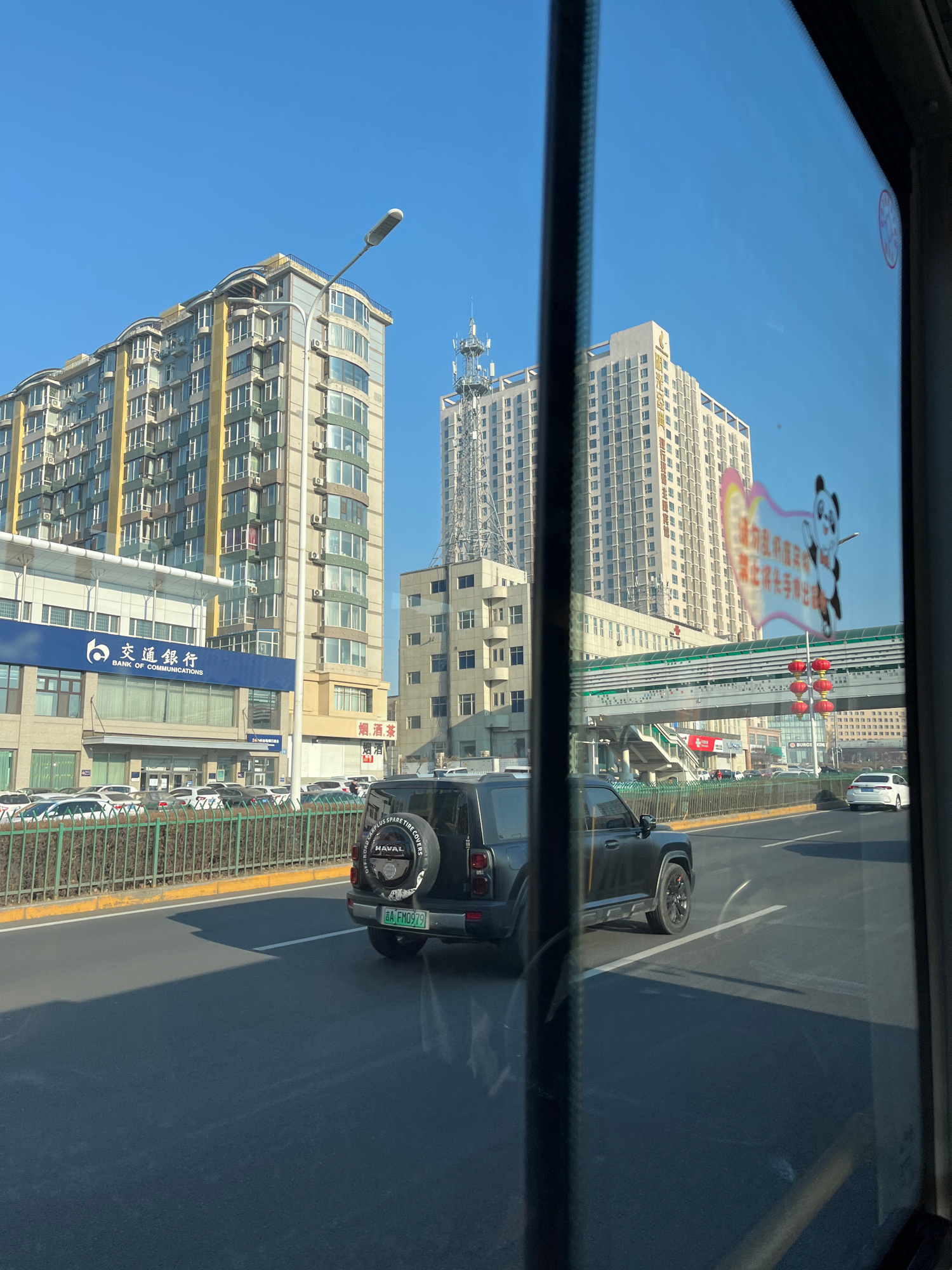 The image, taken from inside a vehicle looking through a window, depicts a street scene in Changchun City, China. Buildings of varying heights, including residential and commercial structures, are vis…read more