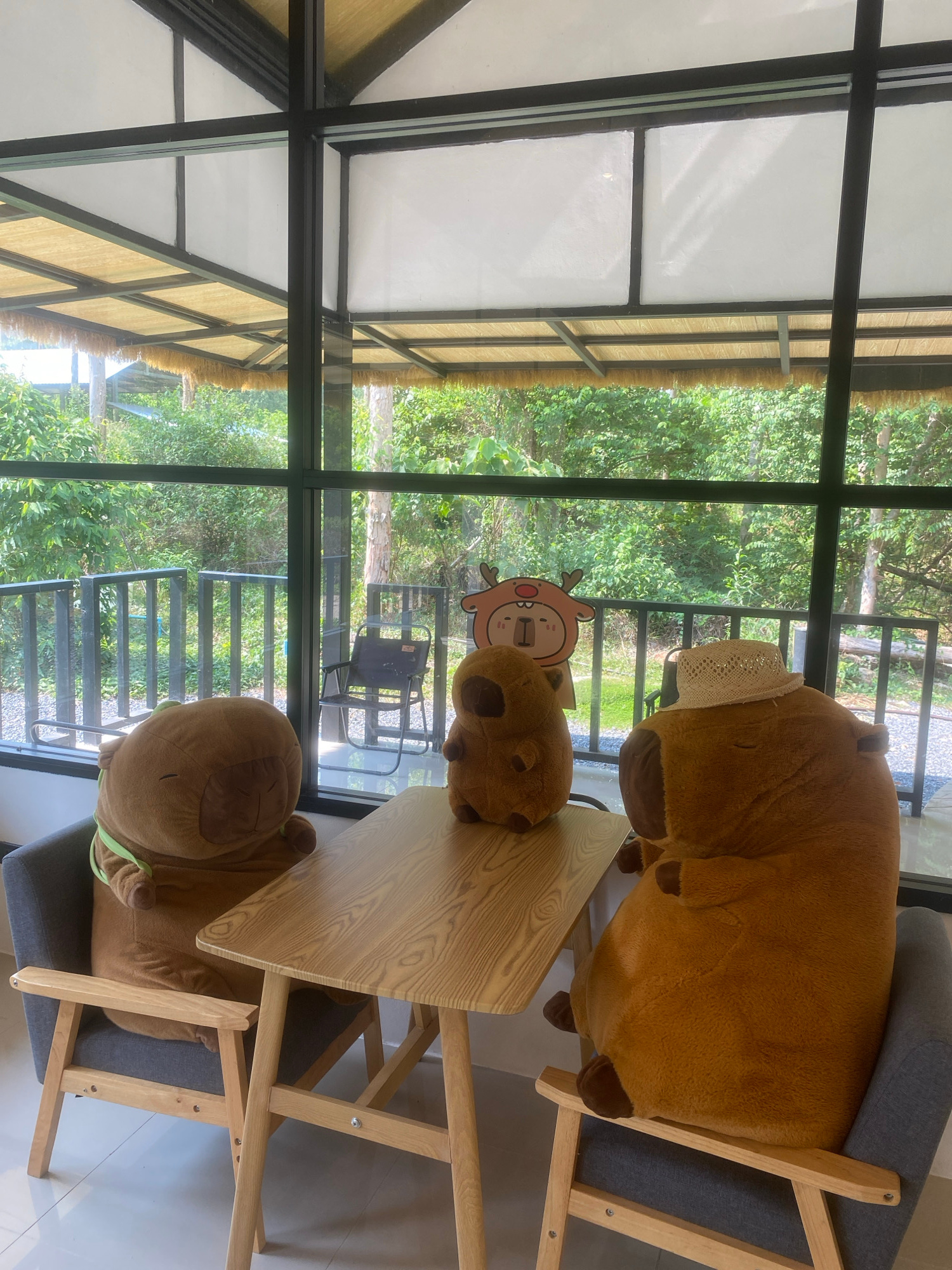The image depicts an indoor scene, likely a cafe or restaurant in Choeng Thale, Thailand, viewed through a large, black-framed window. Three large, brown stuffed animals, resembling capybaras or simil…read more