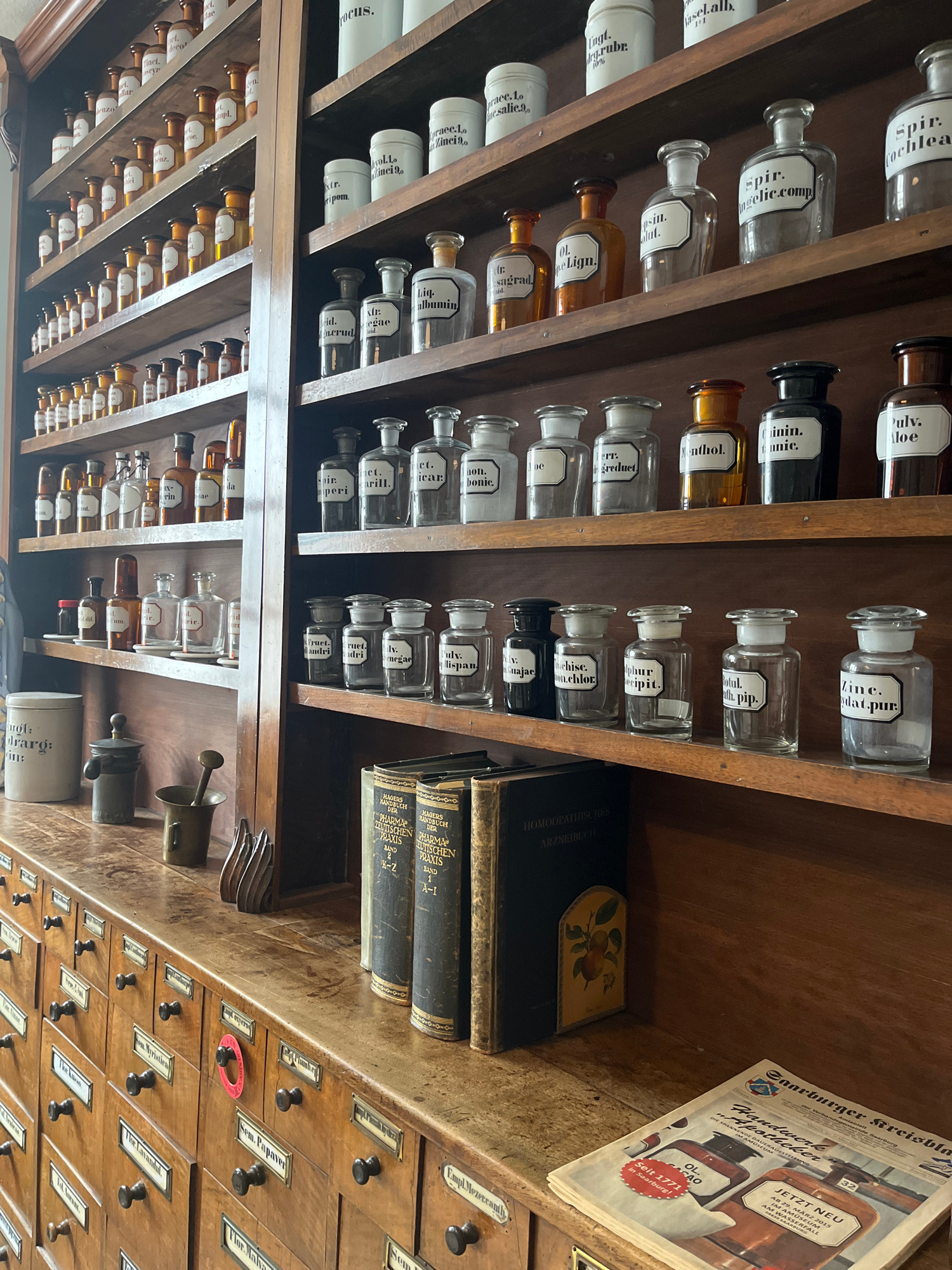 The image depicts a vintage apothecary setup, likely within a museum in Saarburg, Germany. Shelves are filled with numerous labeled glass bottles and jars containing various medicinal ingredients. Bel…read more