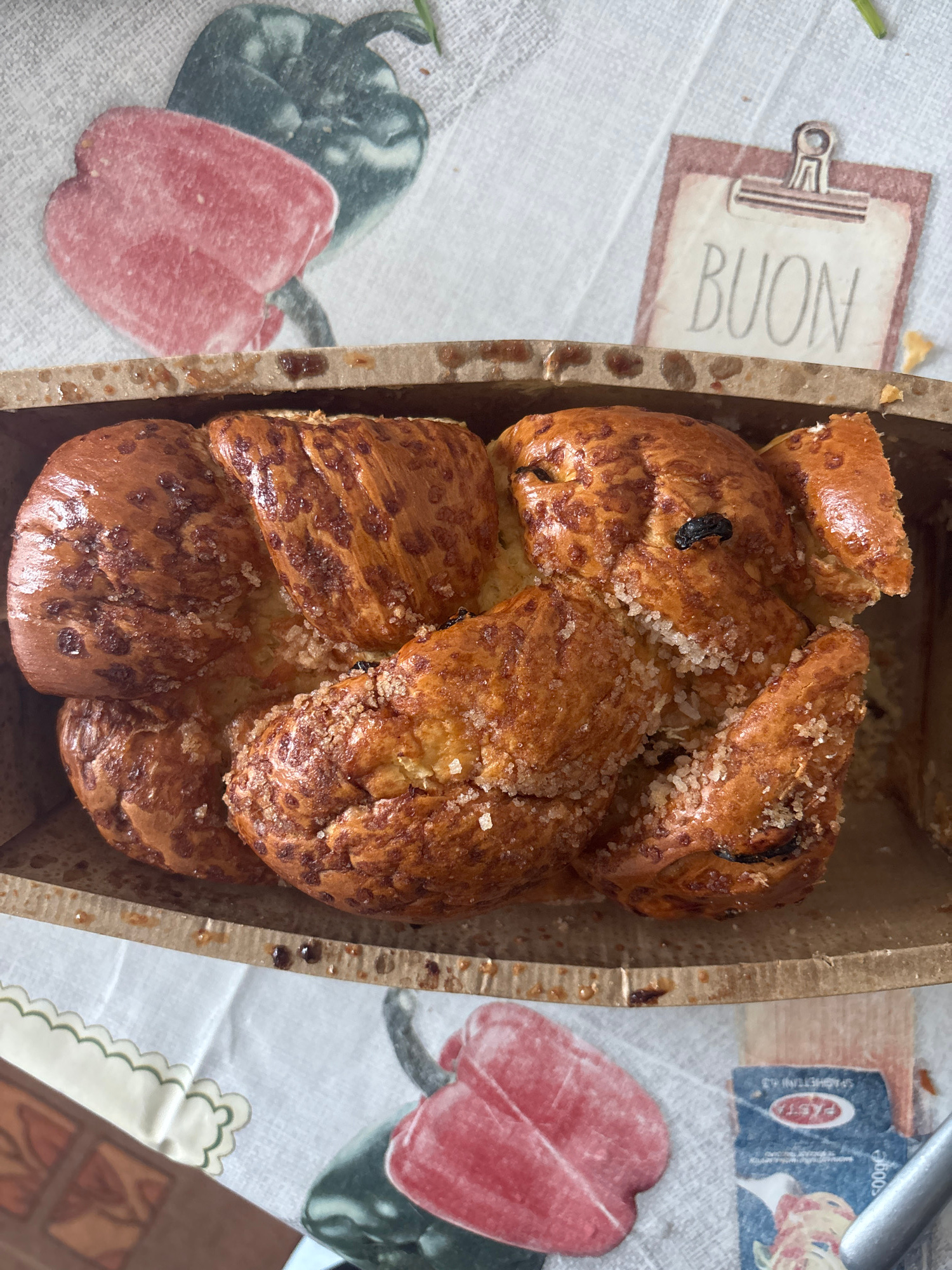 The image shows a brioche loaf in a rectangular cardboard container, sitting on a patterned tablecloth. The brioche is golden brown, topped with coarse sugar crystals, and appears to contain raisins o…read more