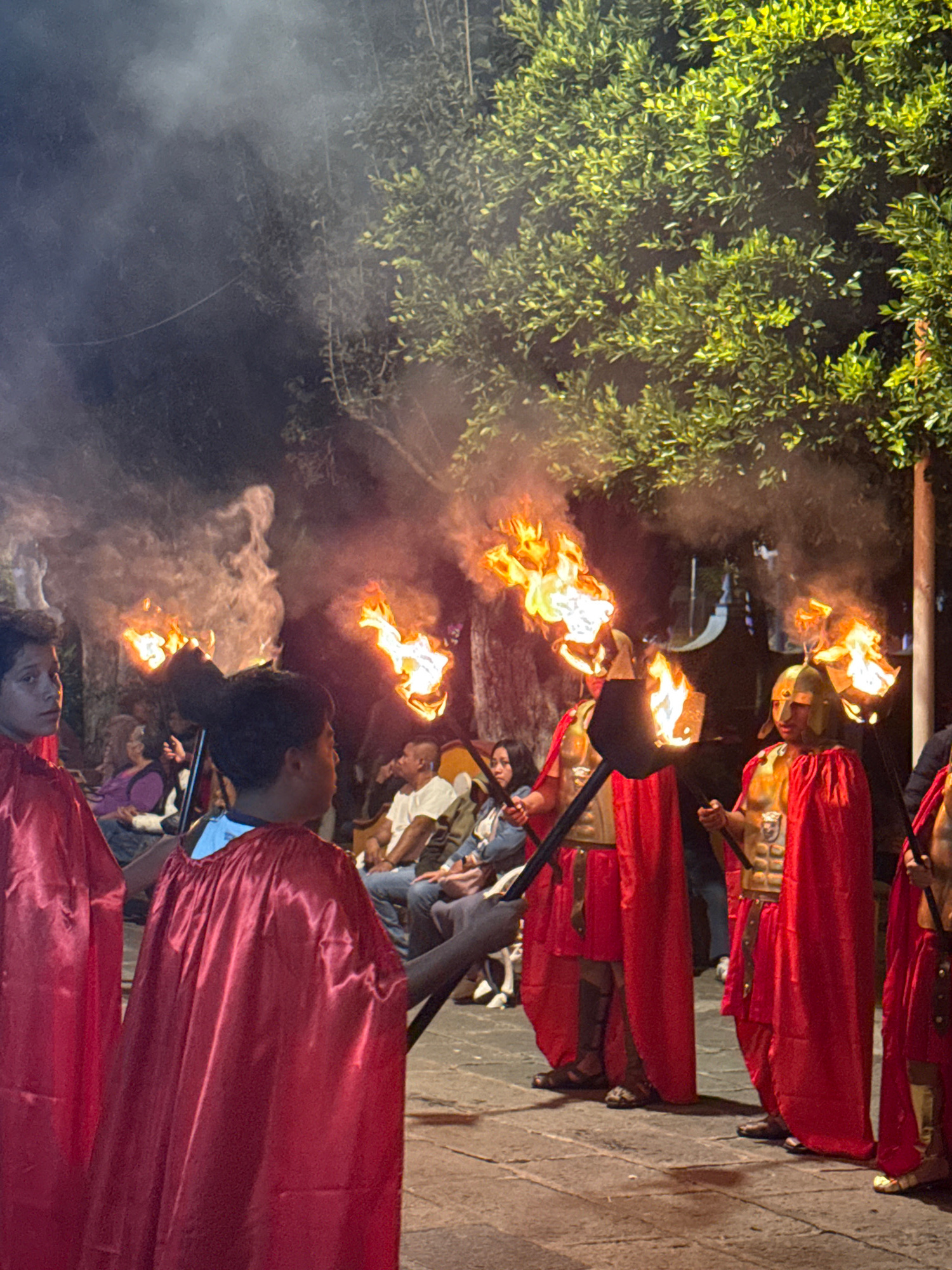 The image depicts a night scene in San Andrés Cholula, Mexico. A group of people dressed as Roman soldiers is walking with torches. The soldiers wear red robes and helmets and are holding long poles w…read more