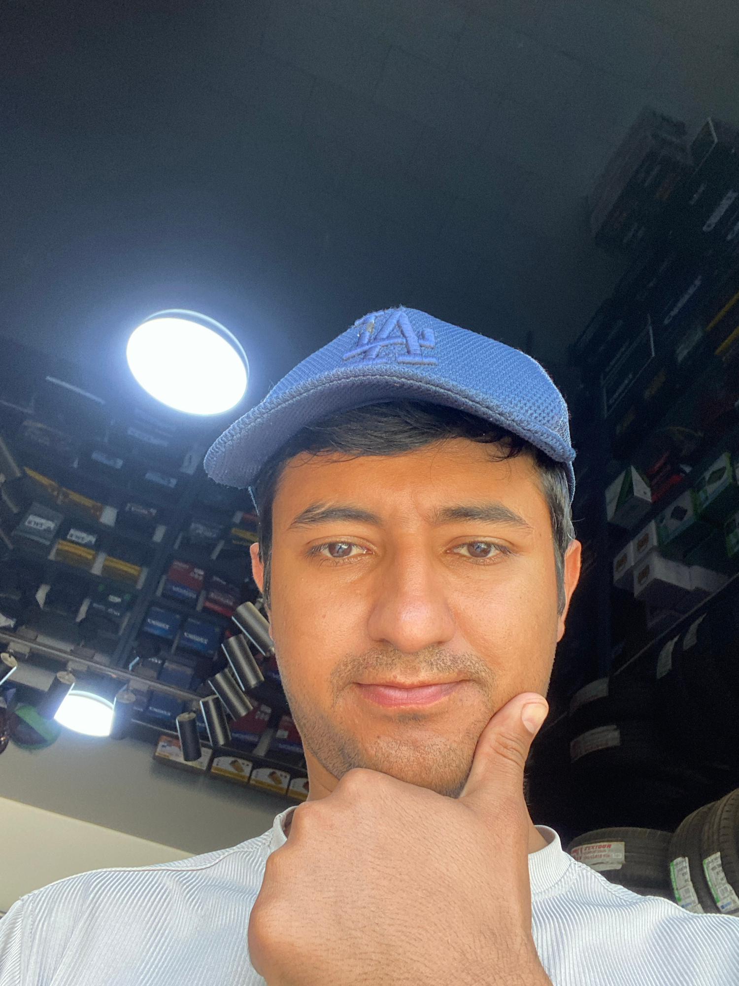 A man with medium brown skin and dark hair is wearing a blue baseball cap with an embroidered logo. He is wearing a light blue button-down shirt. He is touching his face with his right hand. The background consists of shelves stacked with various items and two bright lights. Based on available information, the location is an automotive shop in Bukhara, Uzbekistan. | Open Wire