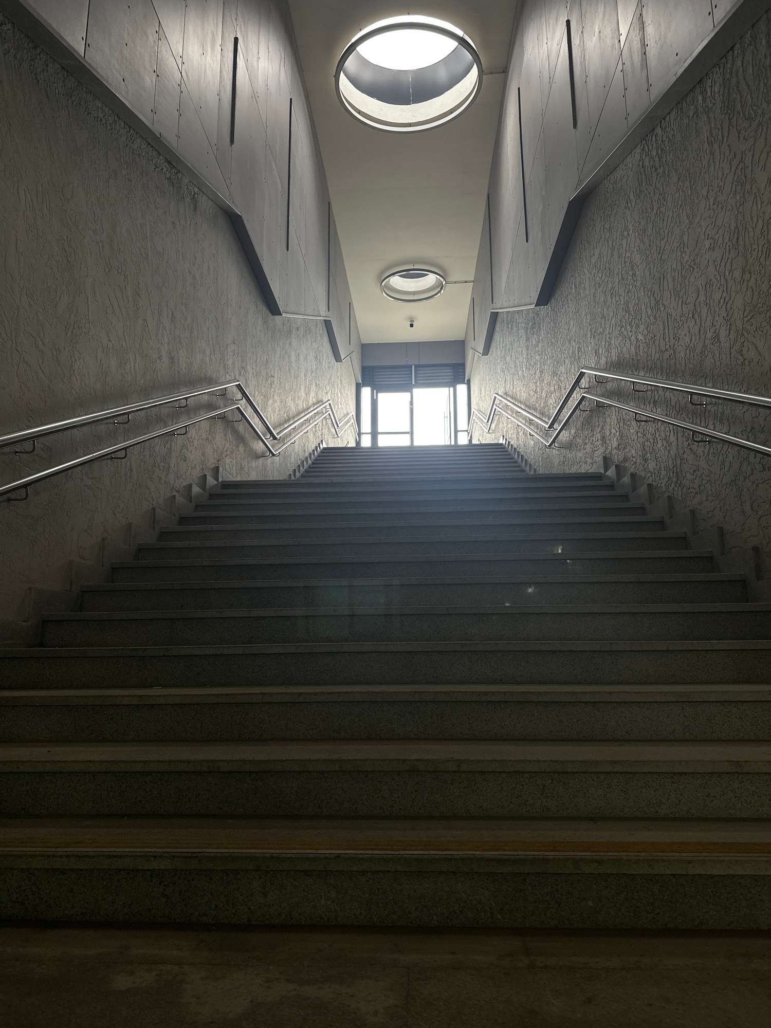 The image shows an interior view of an inclined walkway or ramp at the Kazan Family Center in Kazan, Russia. The space is characterized by modern architectural design. A wall to the left features larg…read more