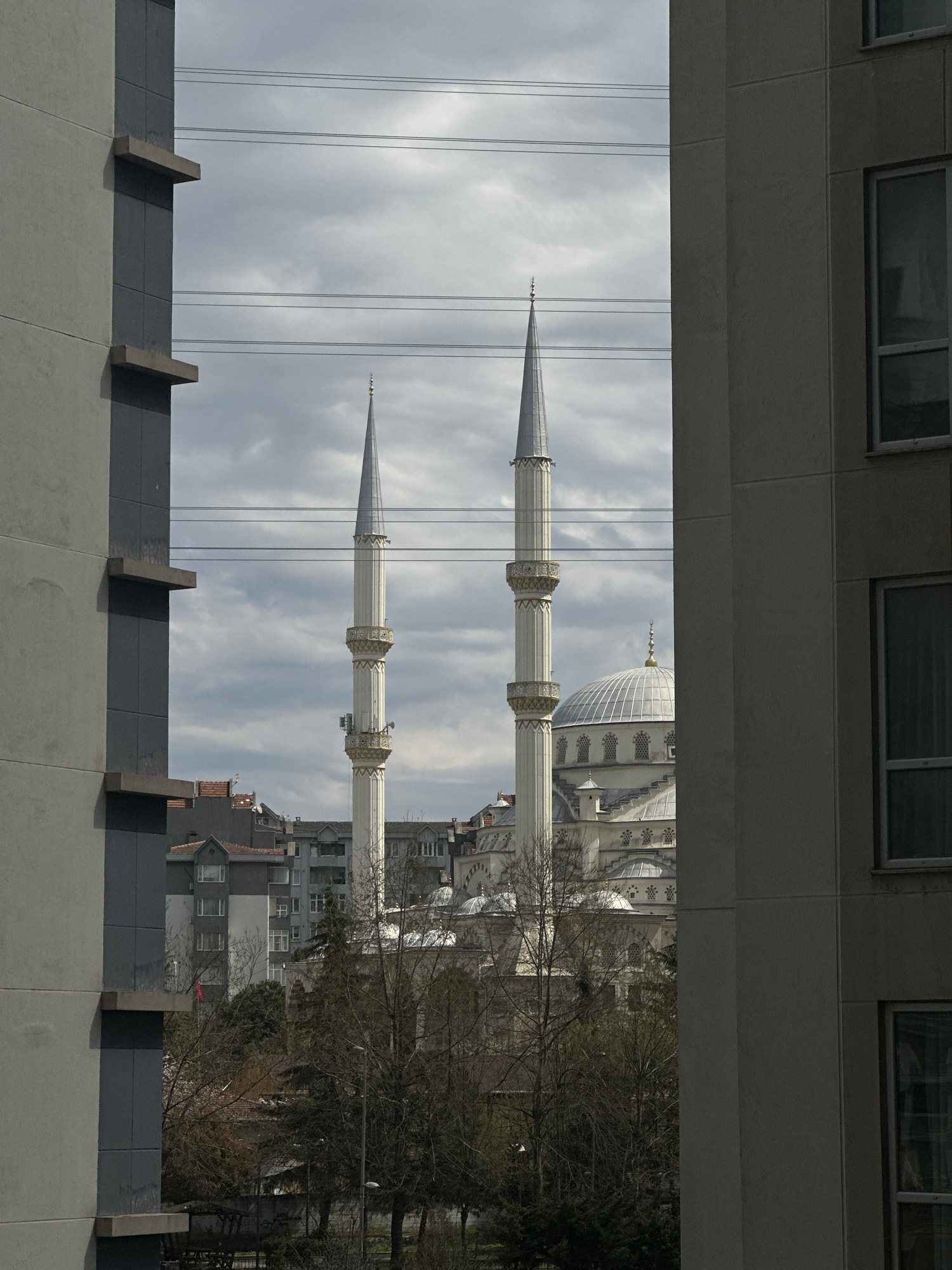 The image is an eye-level, framed shot of a cityscape in Esenyurt, Turkey. The view is captured through an opening between two buildings, giving a framed perspective of the landscape. The focal pointβ¦read more