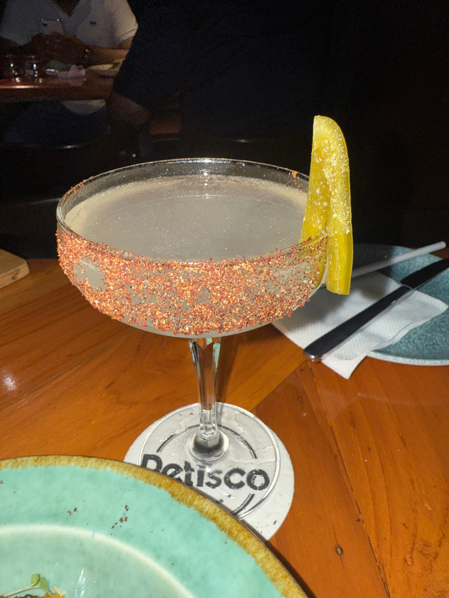 Here is a description of the image: The image shows a cocktail in a coupe glass with a chili-lime salt rim and a pickle garnish on a wooden table. A coaster with the word "Detisco" is visible under t…read more