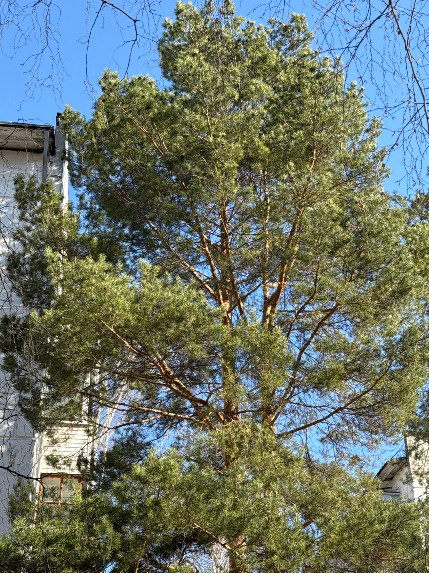The image provides an upward view through the dense canopy of a large evergreen tree, likely a pine or similar conifer, against a vivid clear blue sky in Chaikovsky, Russia. The tree, filling most of…read more