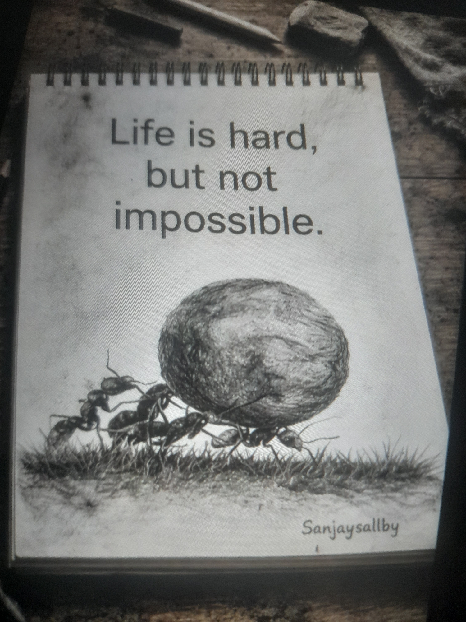 A close-up, slightly angled photograph captures a notebook displaying a motivational image. The notebook, bound by a metal spiral on the left, features the text "Life is hard, but not impossible." The…read more