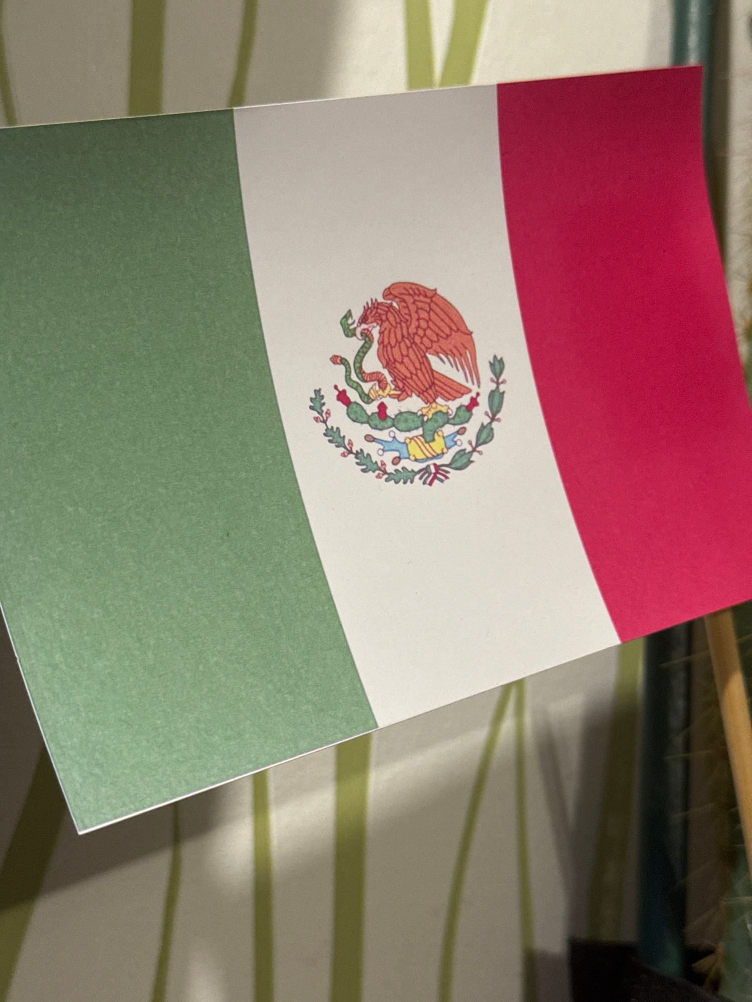 The image shows a printed representation of the flag of Mexico. The colors are red, white, and green, arranged in vertical stripes. In the center, on the white stripe, is the coat of arms featuring an…read more