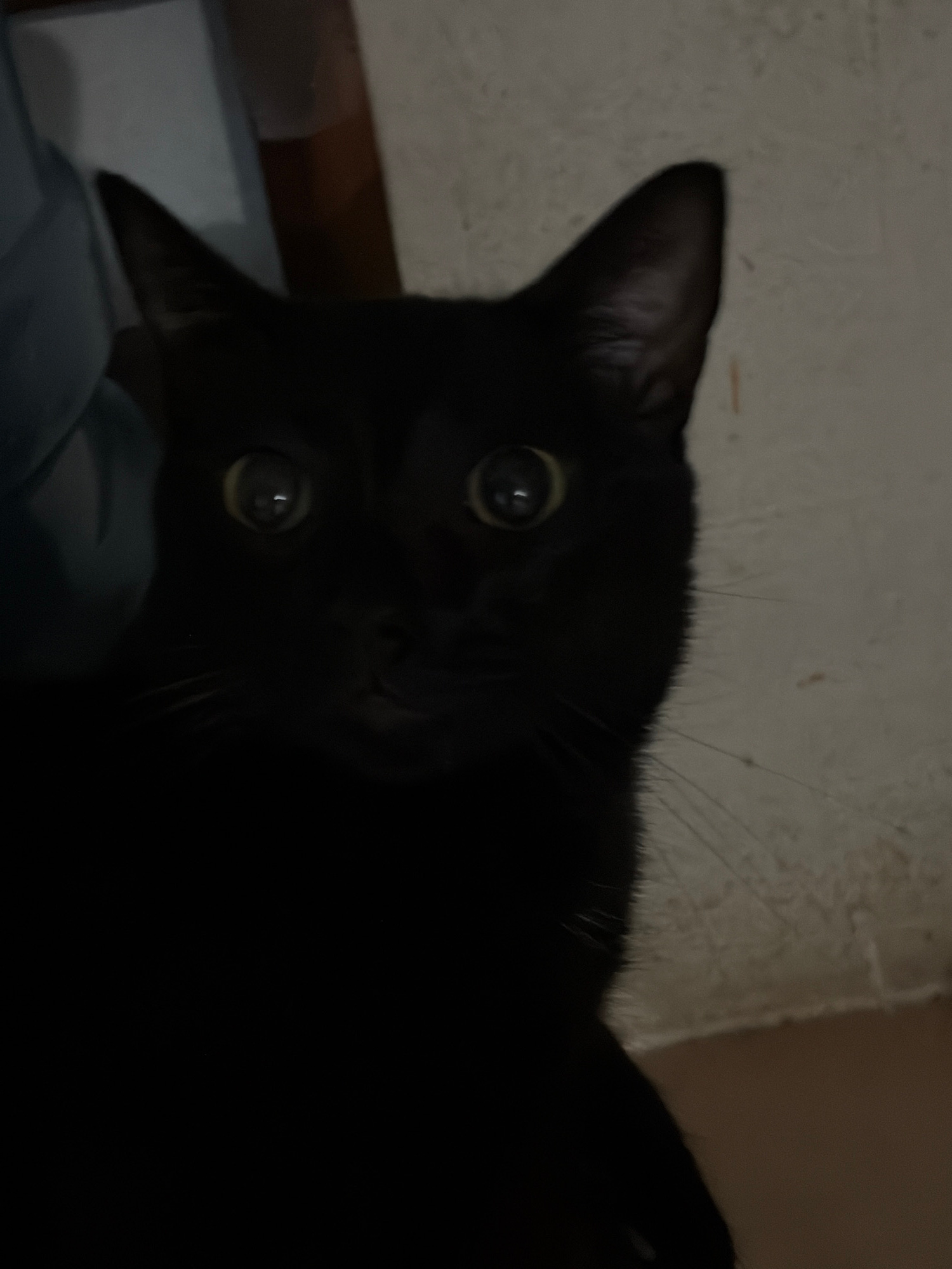 The image features a black cat lying on its side. Its head is tilted, and it is looking directly at the camera with wide eyes. The cat's fur appears dark and glossy. The background is indistinct, show…read more