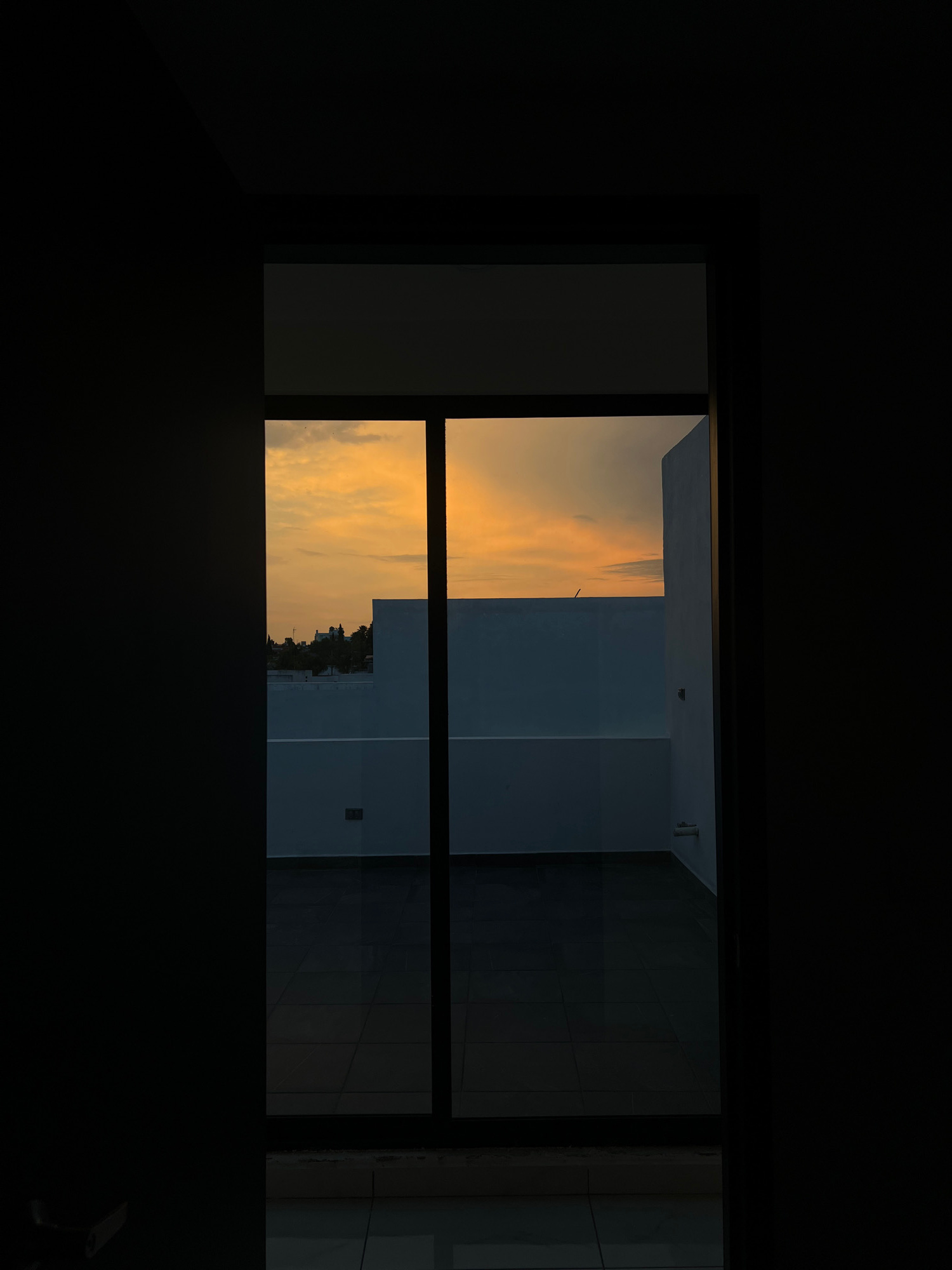The image depicts a view from inside a dark room, looking out of a window at an urban scene in Cholula, Mexico. The sunset sky is visible through the window, with orange and yellow hues. Outside the window is a building with a tiled floor. There is a thin line of trees or vegetation visible in the distance. | Open Wire