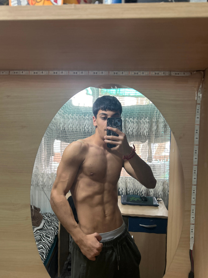 The image captures a mirror selfie taken indoors within a residential setting in Pernik, Bulgaria. A young male, approximately late teens to early twenties, is depicted shirtless, showcasing a muscula…read more