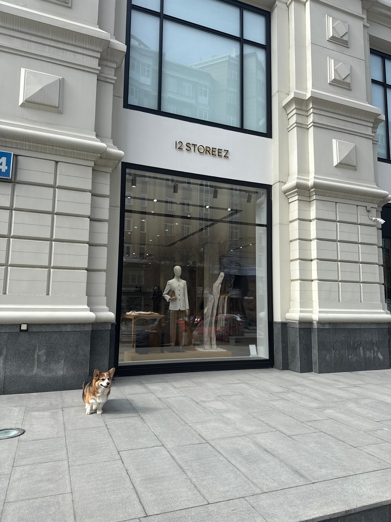 A street-level view captures the storefront of "12 Storeez" in Yekaterinburg, Russia, alongside a corgi dog. The building features a light-colored facade with rectangular patterns and black-framed win…read more