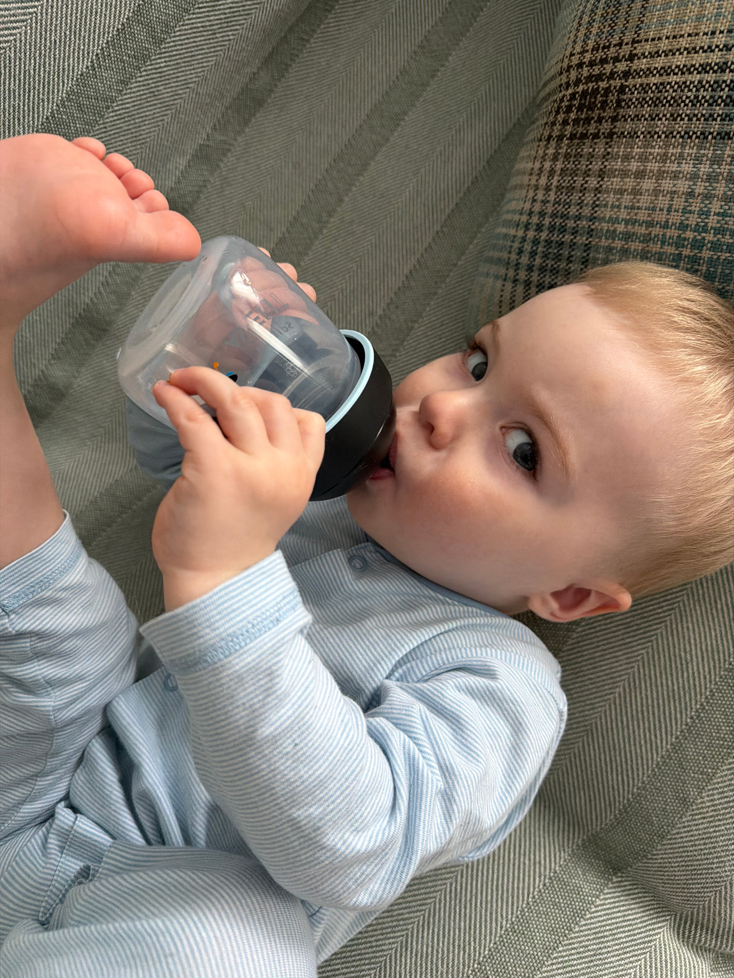 A baby with blond hair and light skin, wearing light blue striped pajamas, is lying on a couch. The baby is drinking from a clear plastic bottle with a black lid. The couch has a gray and beige textur…read more