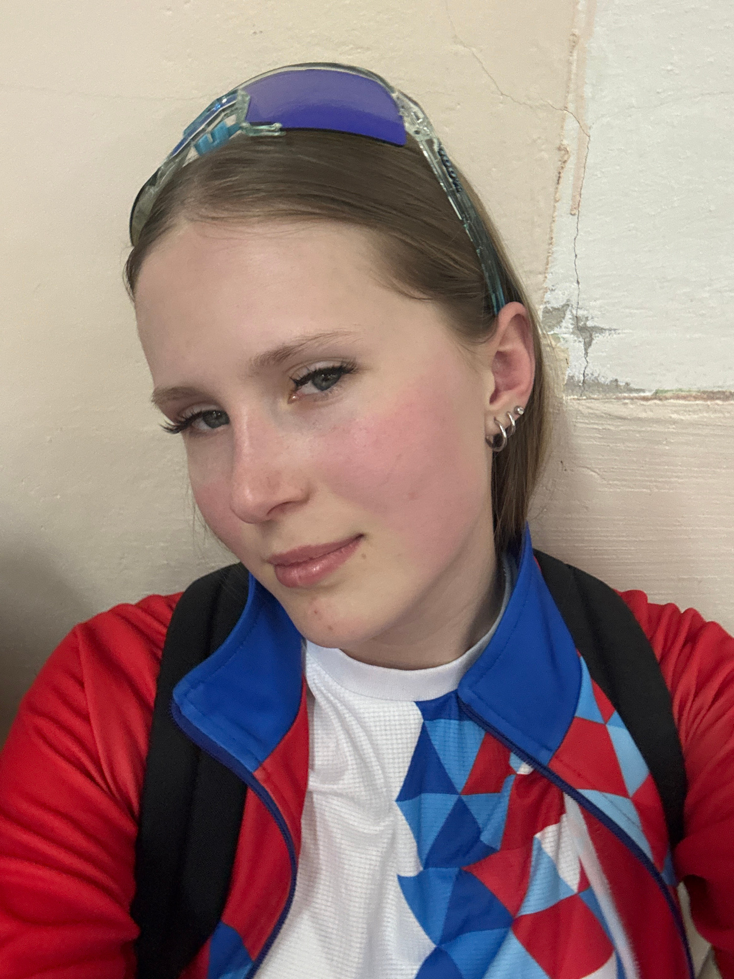A young woman is pictured indoors, appearing to lean against a light beige wall with visible cracks and imperfections. She wears a pair of blue-tinted eyewear on her head. She has fair skin with sligh…read more