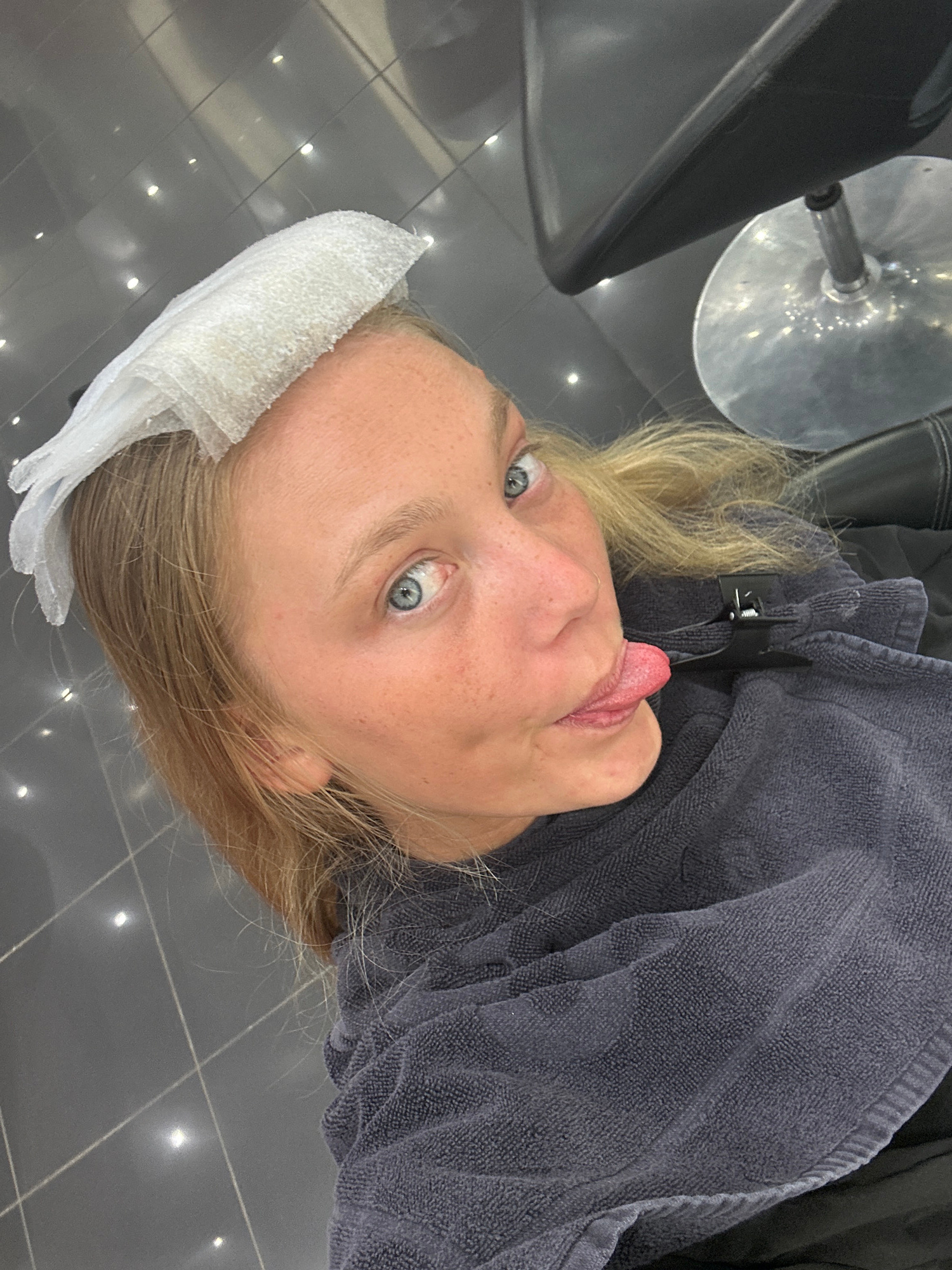 A pale-skinned blonde woman is lying back in a salon chair in Leers, France. She is sticking her tongue out. She is wearing a gray towel around her neck, and a white cloth covers part of her forehead.…read more