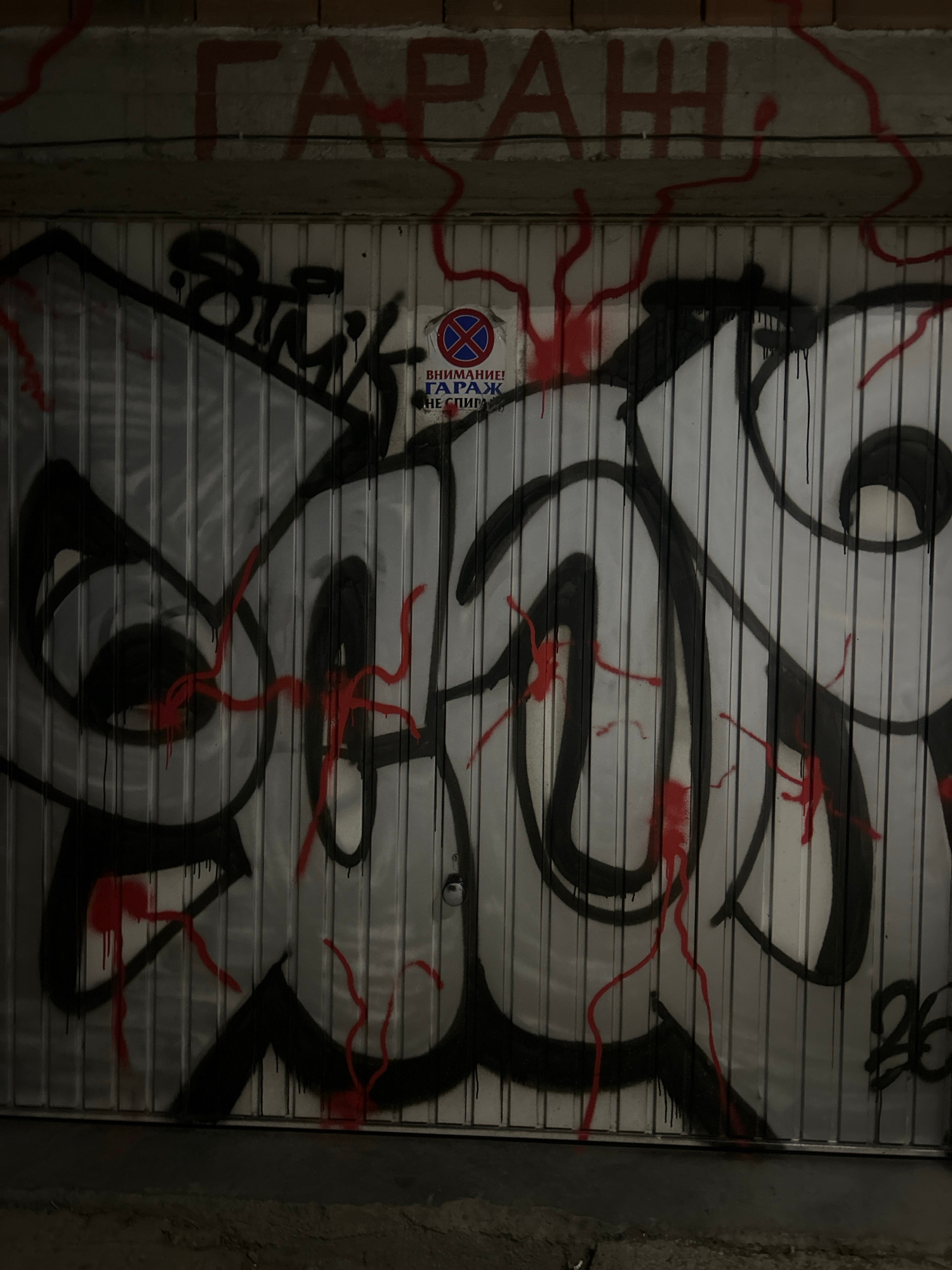 The image shows a gray corrugated metal door covered in graffiti, located in Plovdiv, Bulgaria. The graffiti consists of black abstract shapes and red branching lines resembling veins or cracks. In th…read more