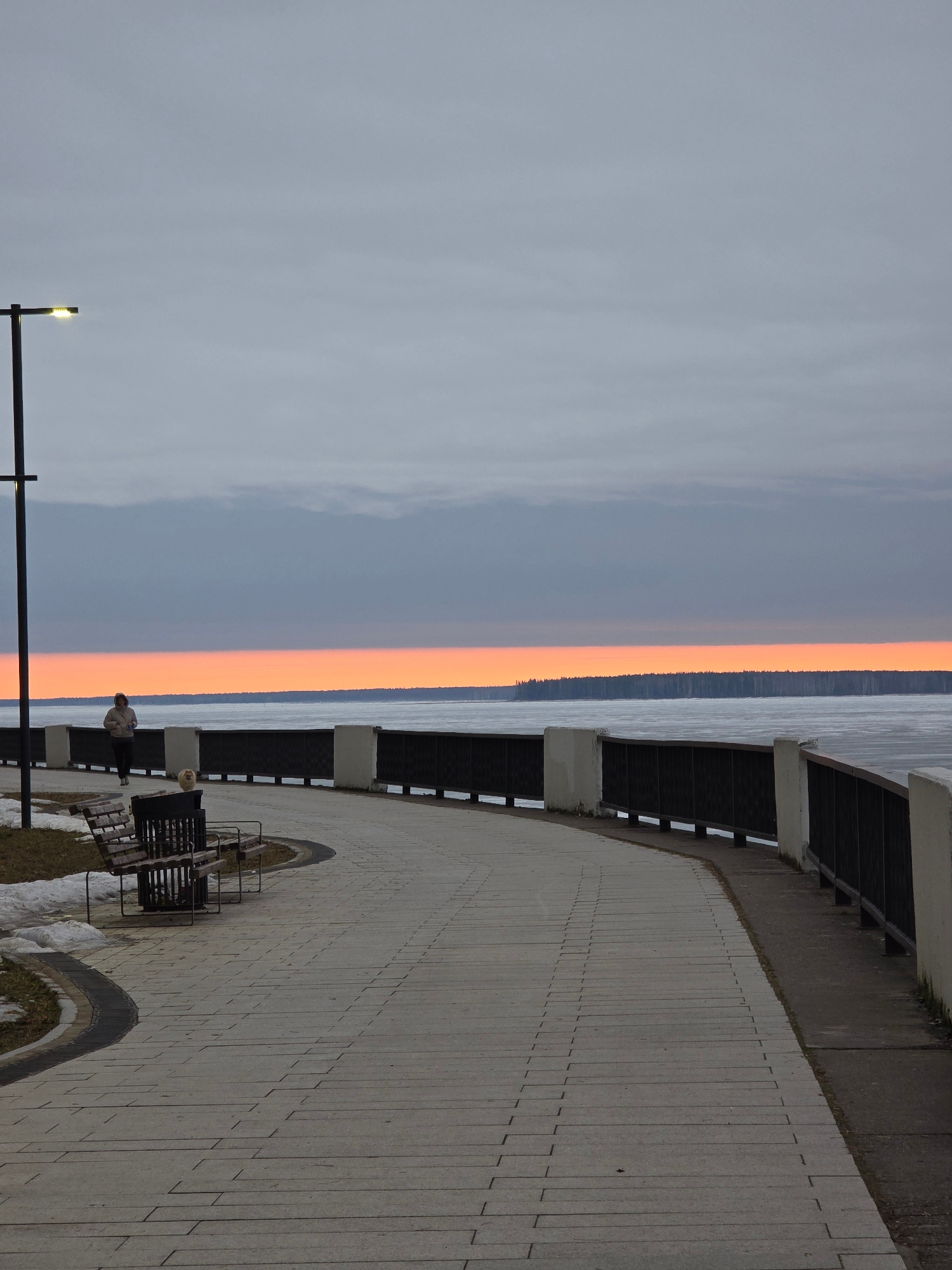 The image shows an embankment view in the city of Chaikovsky, Russia, at what appears to be sunset. To the left of the embankment is a body of water with a strip of trees along the horizon. Above the…read more