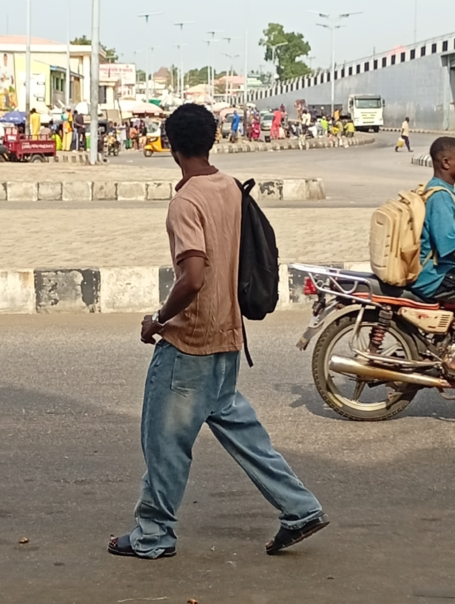 A medium shot shows a man crossing a street in Lokoja, Nigeria, with a black backpack slung over his left shoulder. He wears a light brown t-shirt and faded blue jeans, with dark sandals. A motorcycle…read more