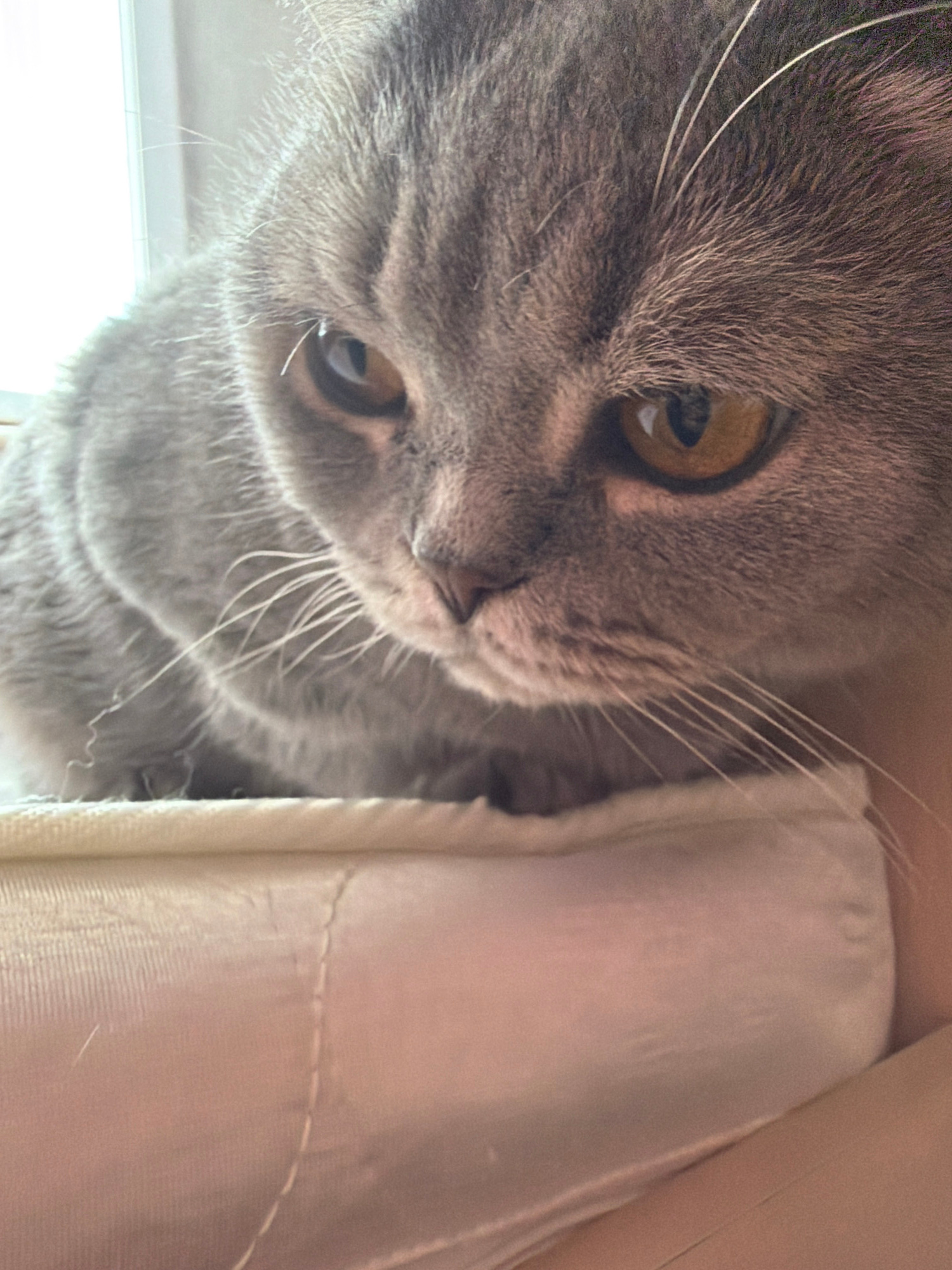 A close-up, low-angle shot captures a grey cat peering downward or towards the viewer from an elevated or enclosed position. The cat, likely a British Shorthair with its dense grey fur and round face,…read more