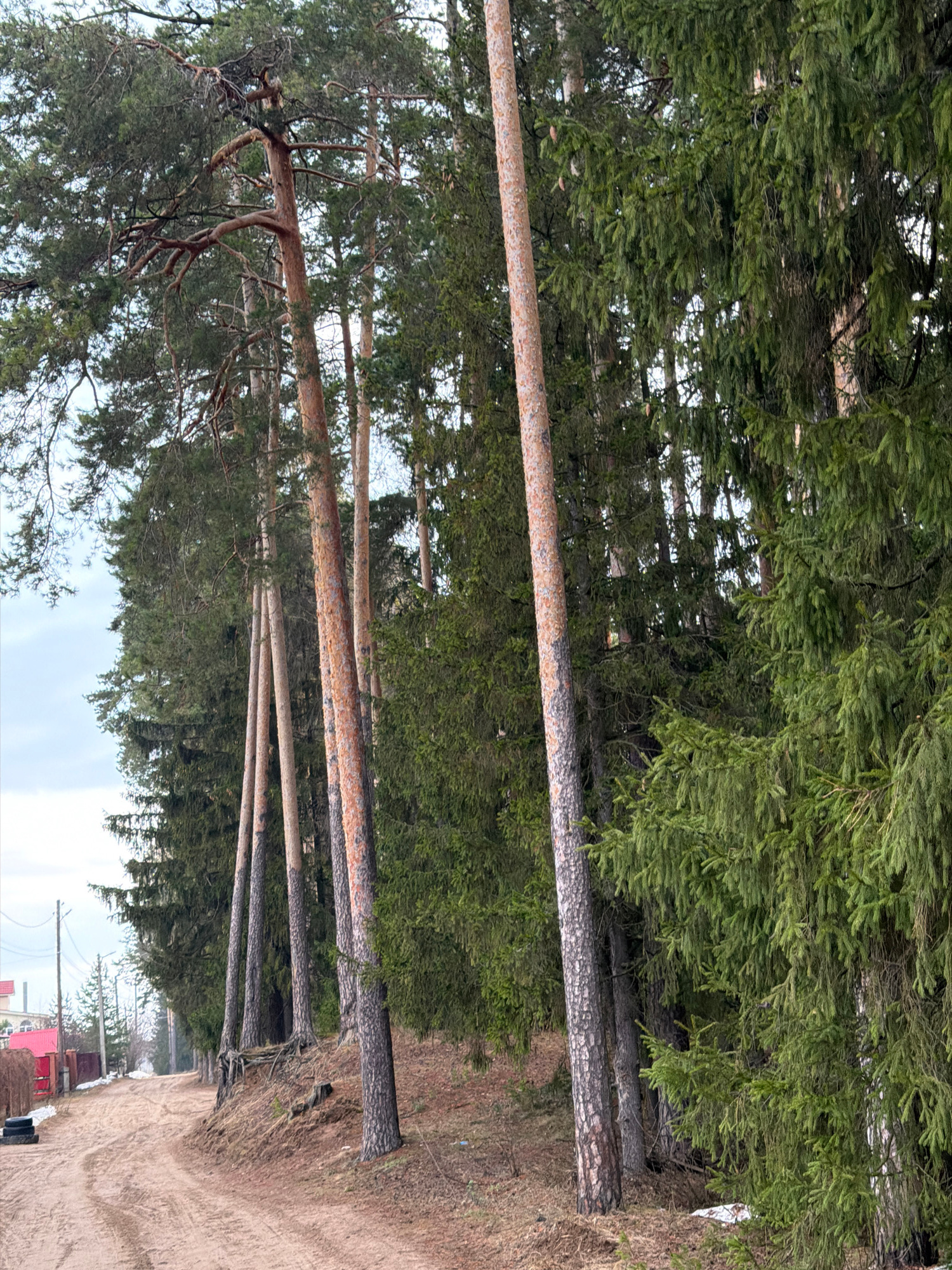 The image depicts a row of tall trees, likely pines, lining a sandy road in Chaikovsky, Russia. The trees are predominantly green, with long, bare trunks leading up to dense foliage. The road runs parβ¦read more