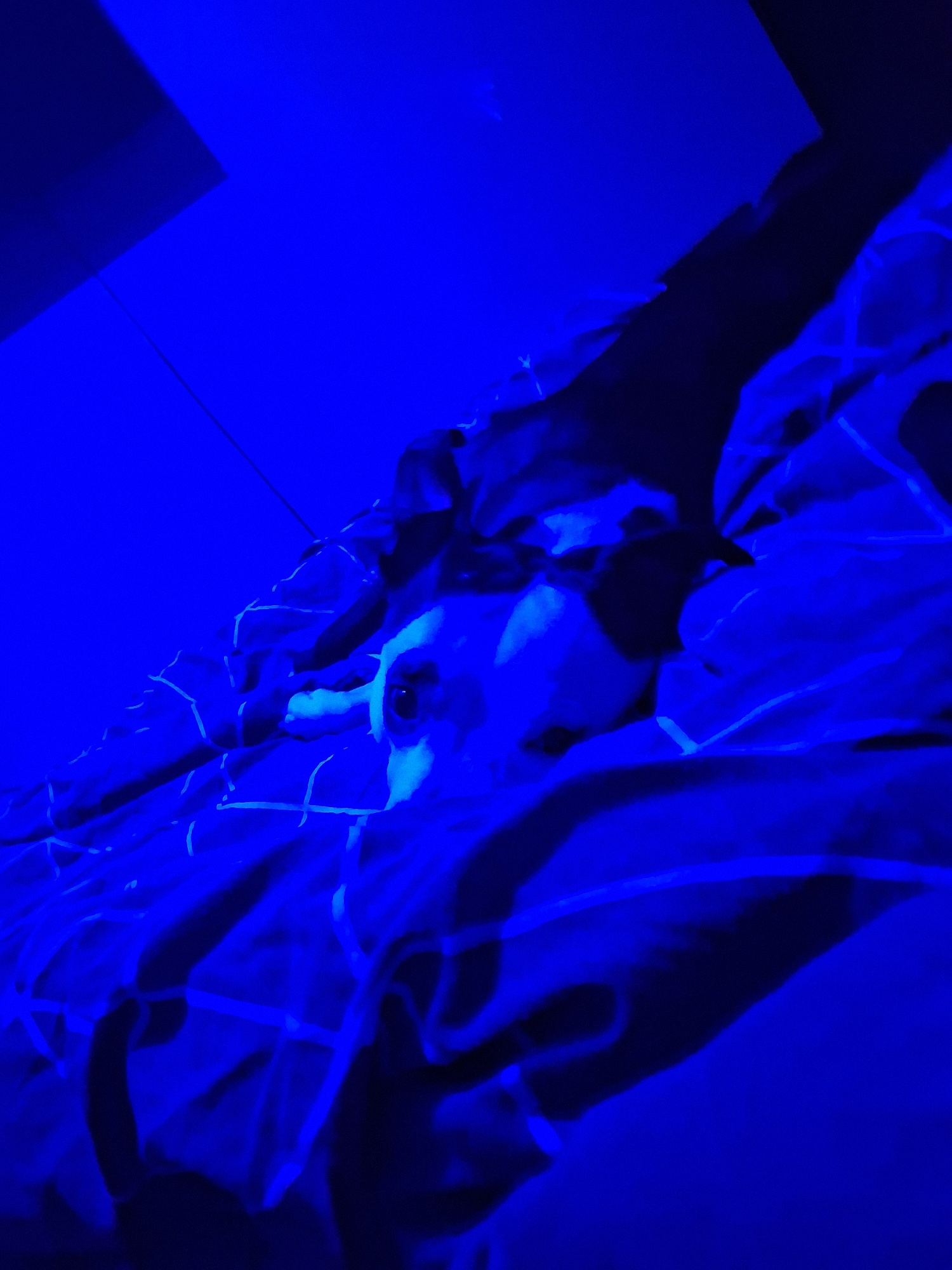 The image, dominated by a blue hue, captures a person lying under a sheer fabric. The face is partially visible, with one eye clearly discernible. The environment is obscured, though geometric shapes…read more