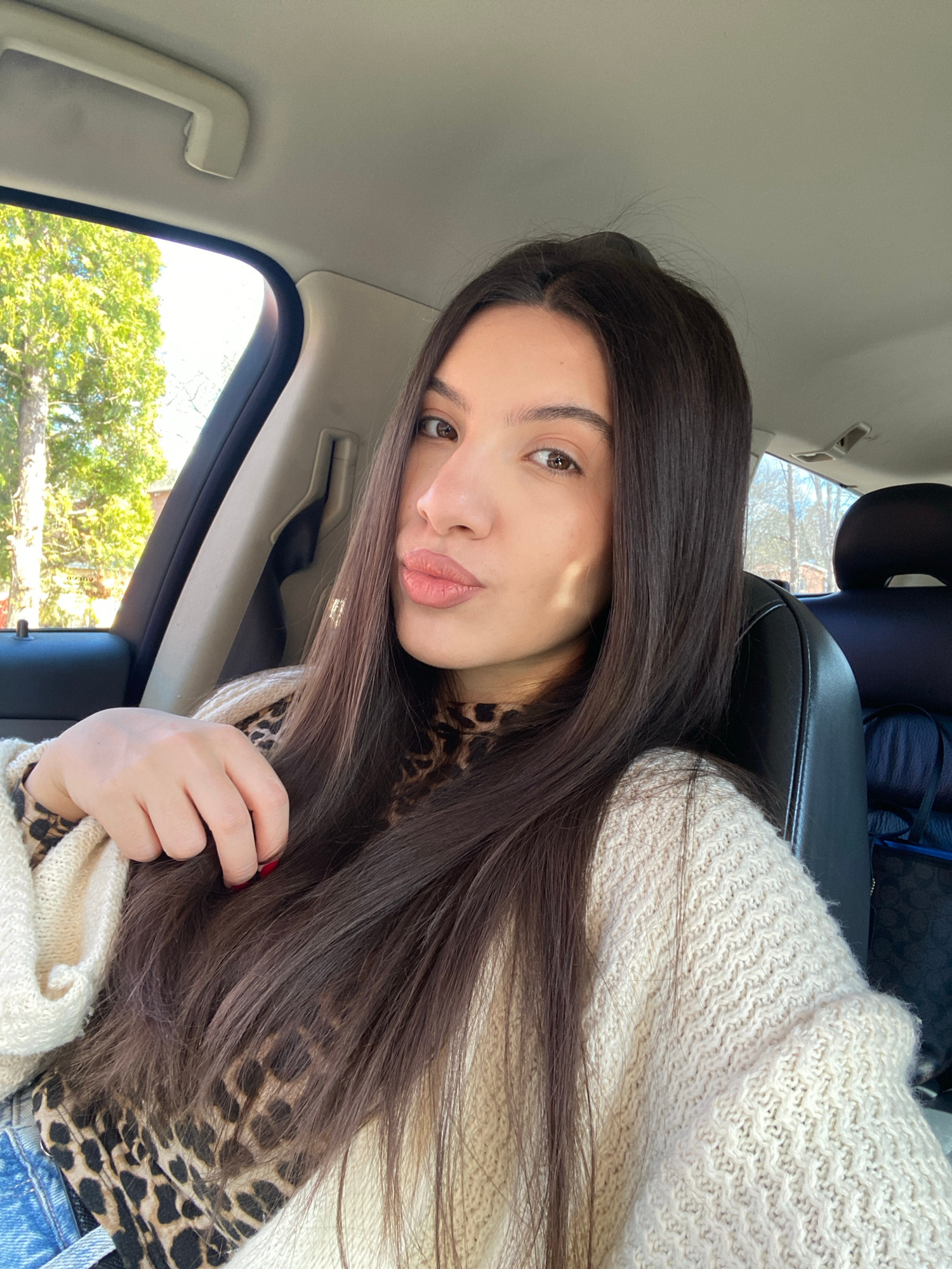 A young woman with long, dark brown hair is taking a selfie while inside a vehicle. She is wearing a cream-colored knit sweater over a leopard-print top. The view through the car window shows green tr…read more