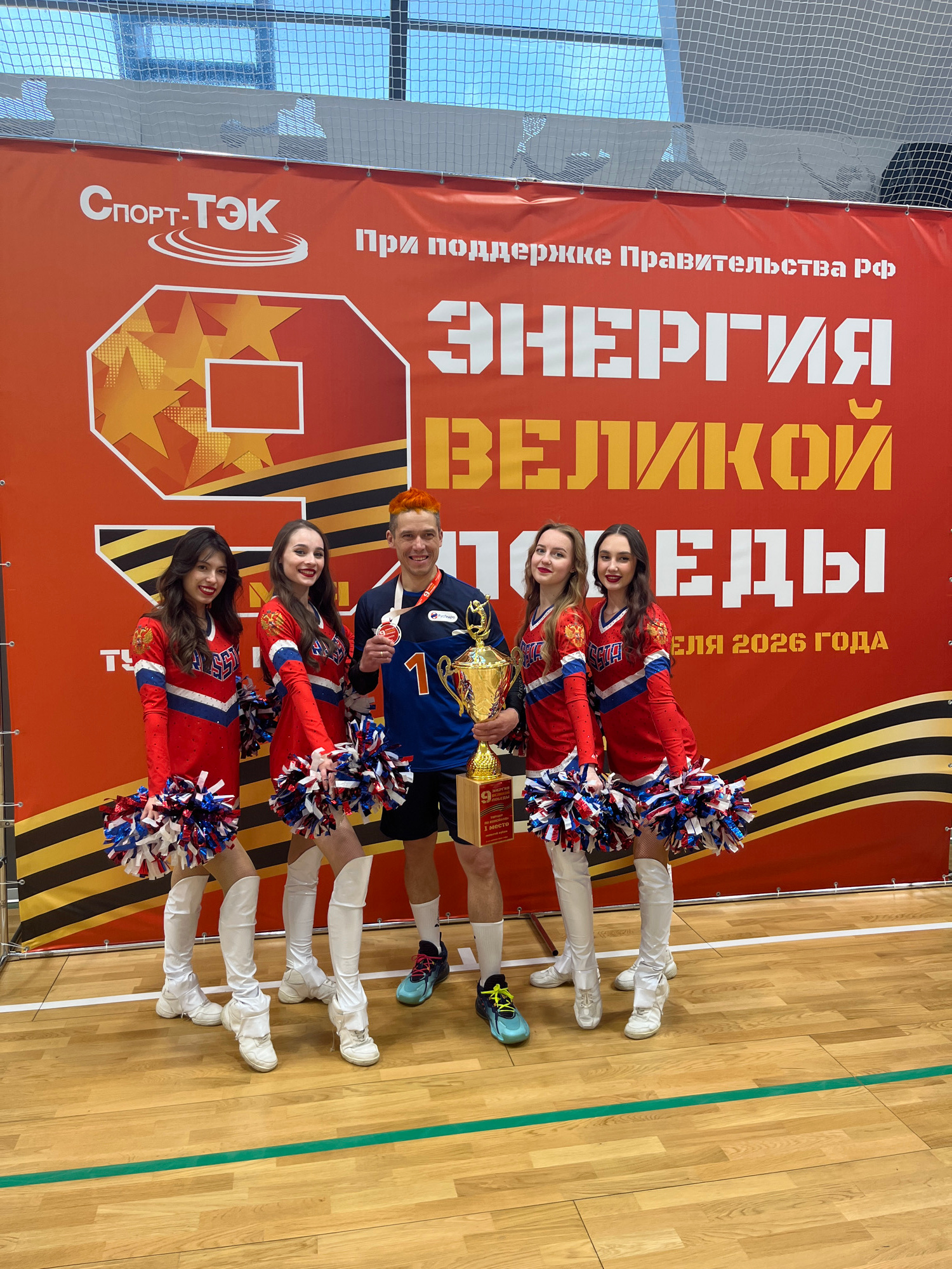 Here is a detailed description of the image: **Scene:** The image appears to be taken indoors, possibly in a sports hall or gymnasium. A group of people are posing in front of a large banner. **Bann…read more