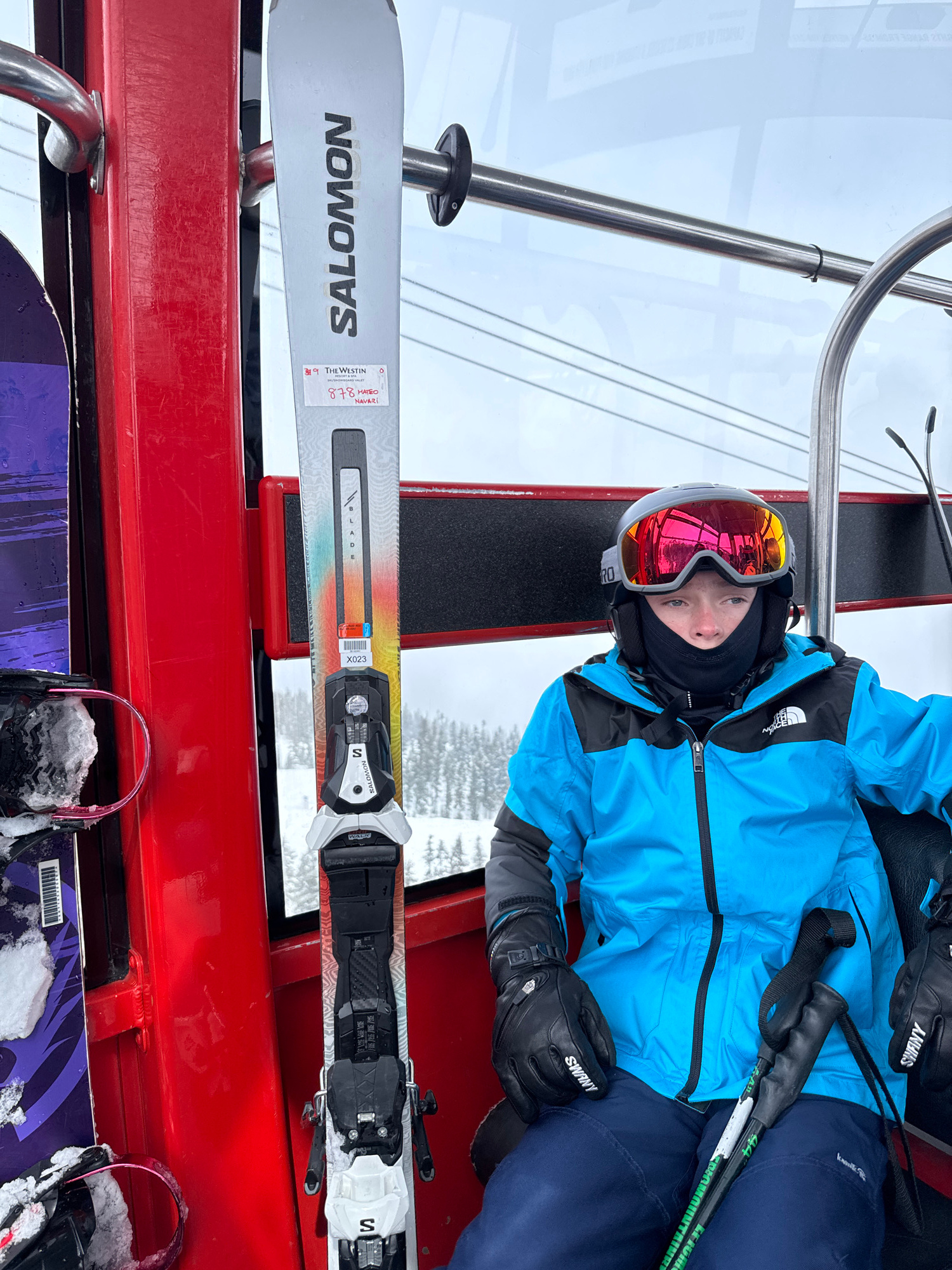 Here is a description of the image. The photograph appears to have been taken inside a ski lift or gondola. A young person wearing a bright blue ski jacket, black neck gaiter, and ski goggles with mi…read more