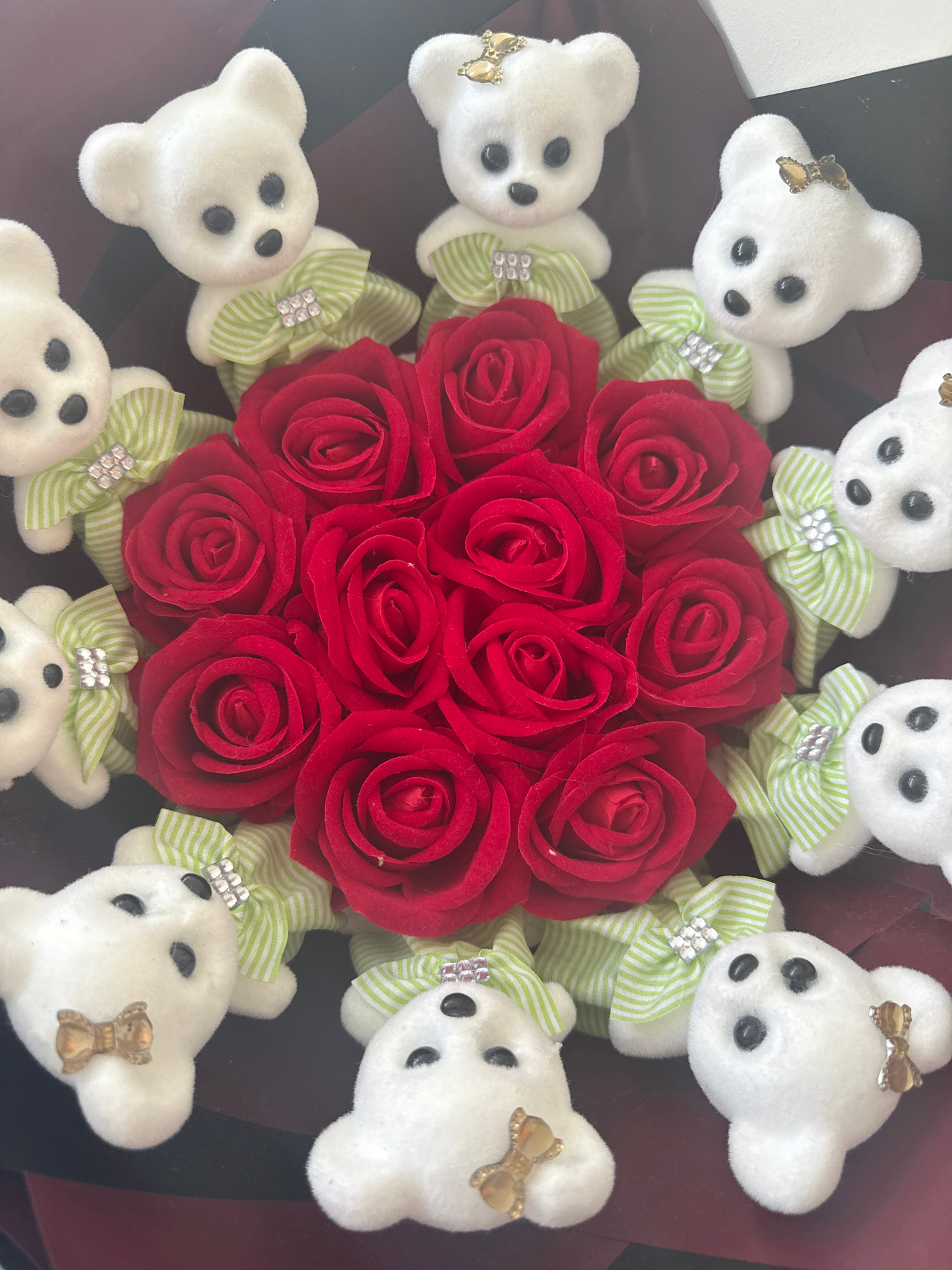 The image depicts a decorative arrangement, likely a gift item, situated in Alanya, Turkey. A central cluster of approximately 15 artificial deep red roses is surrounded by 13 small, white, flocked be…read more