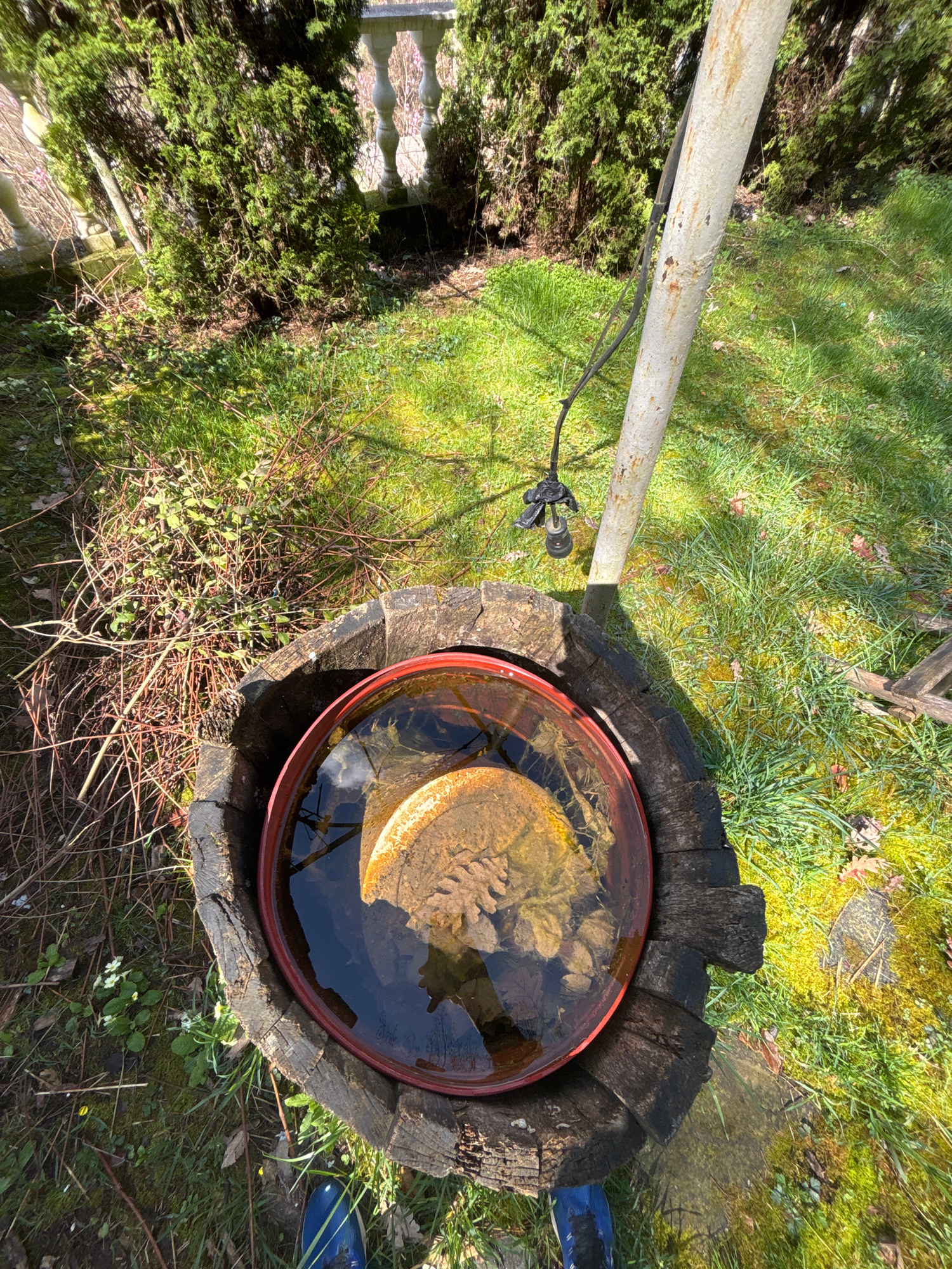 The image shows an outdoor scene, likely in Alamovtsi, Bulgaria, although there is no explicit visual confirmation of the location. The focal point is a makeshift bird bath or water container nestled…read more