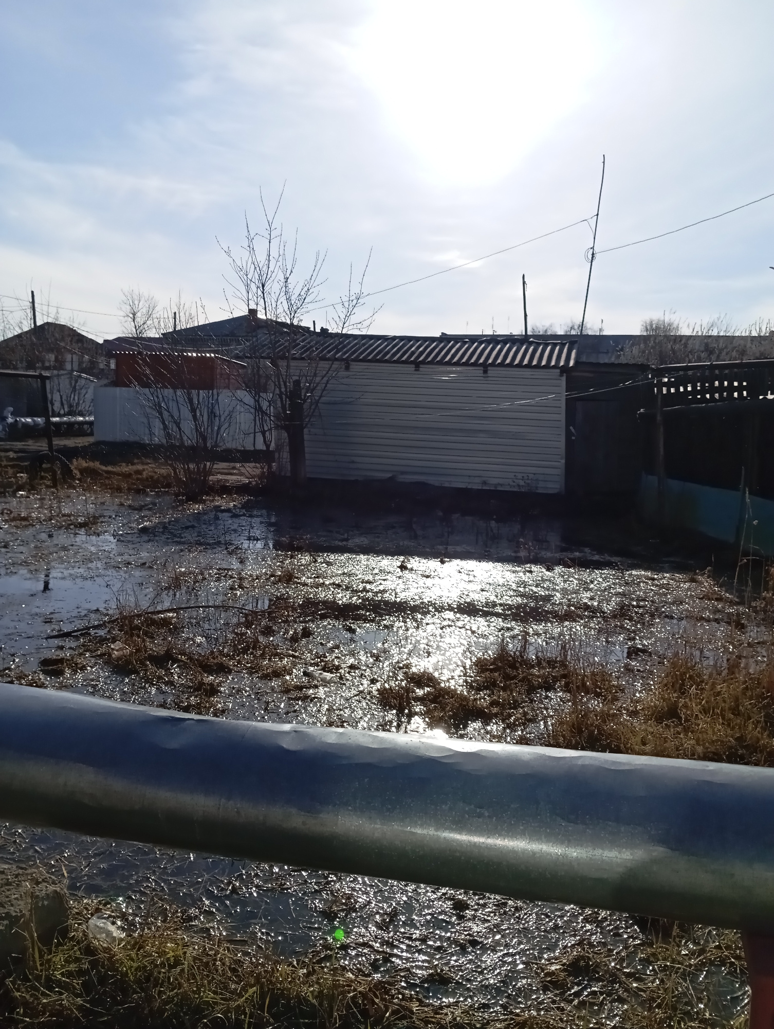 The image shows an area in Yurgamysh, Russia, apparently flooded. The water reflects the sunlight, creating a shimmering effect. Vegetation protrudes from the water. In the background, there are build…read more