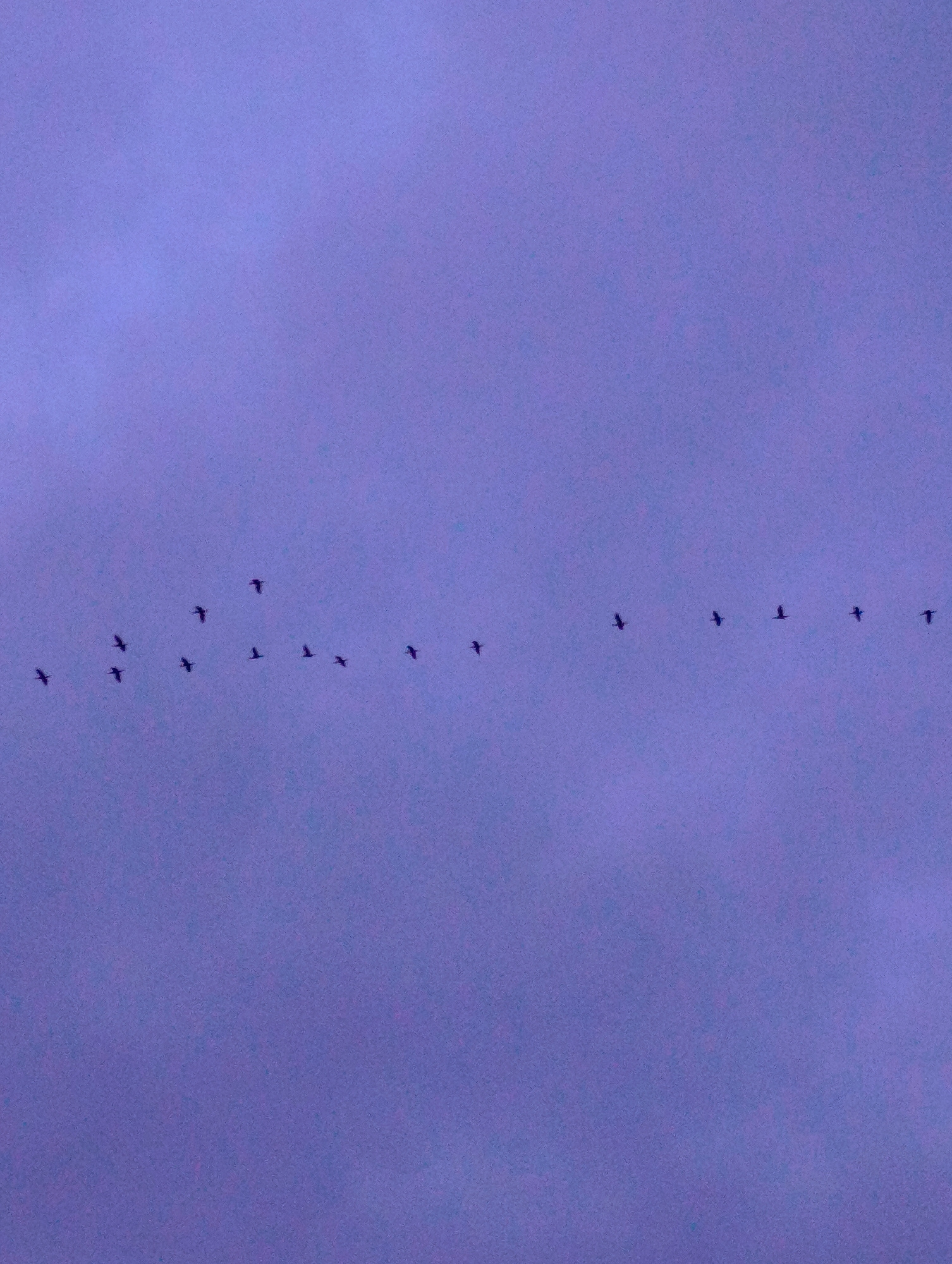 The image depicts a flock of birds flying in formation across a pale purple sky. The birds appear as dark silhouettes against the sky. The image does not provide enough information to determine a spec…read more