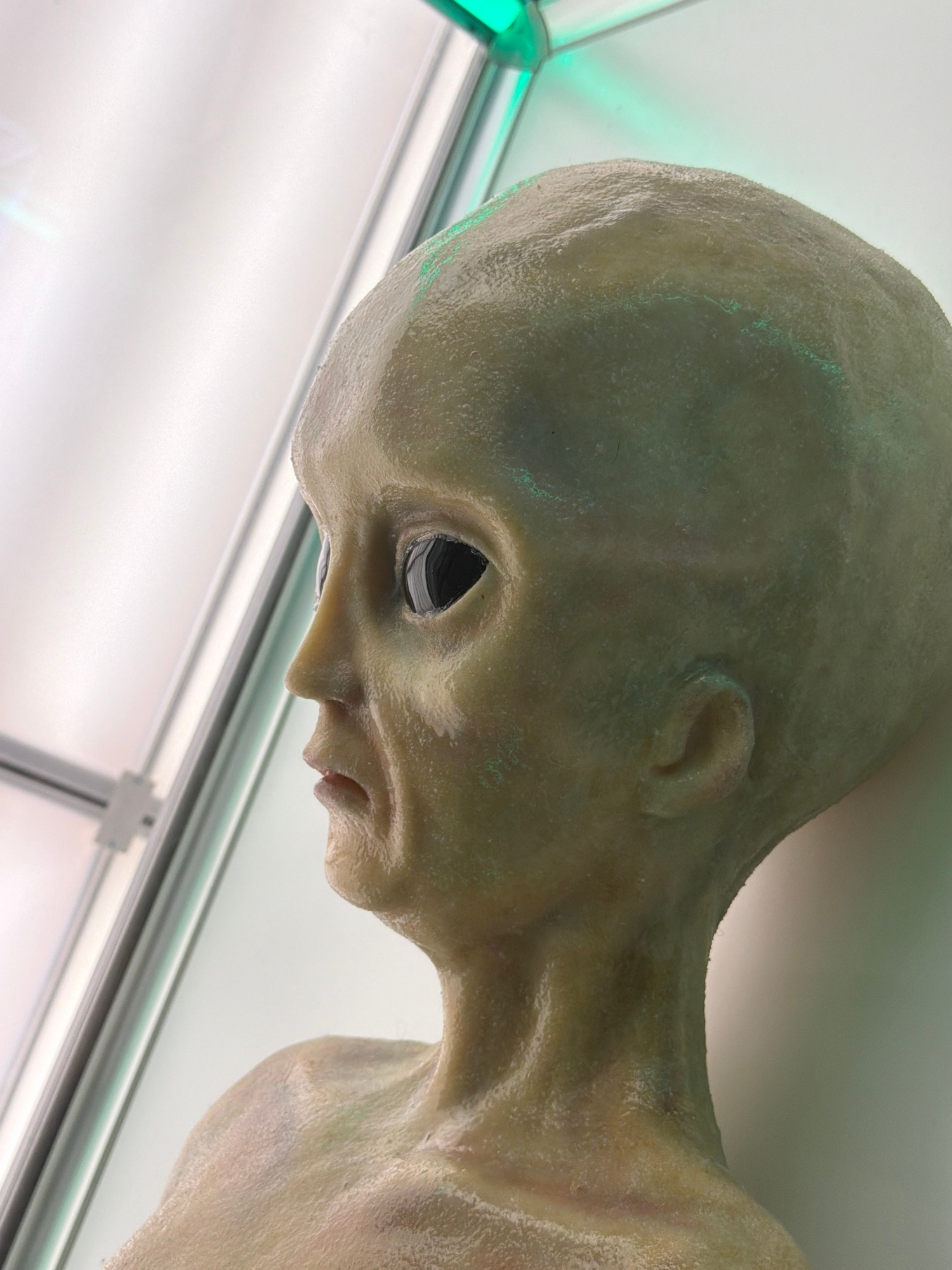 A pale, humanoid figure with an elongated head, large dark eyes, and thin features lies on a reflective surface. The background is a white, possibly illuminated, display case with a metal frame. The f…read more