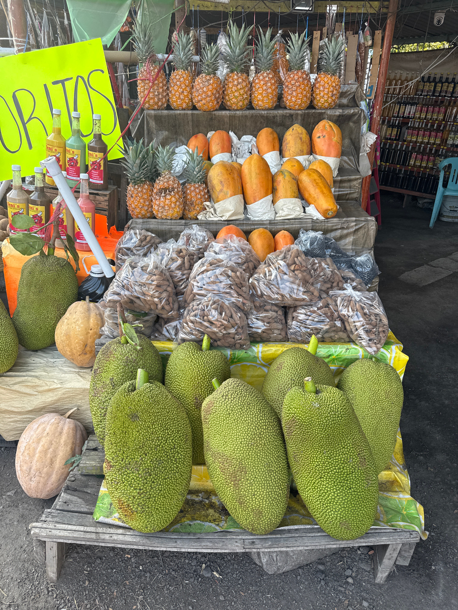 The image shows a fruit stand in Puente Nacional, Mexico. The stand is stocked with pineapples, papayas, tamarind in plastic bags, and jackfruit. There are also bottles of what appear to be sauces or…read more