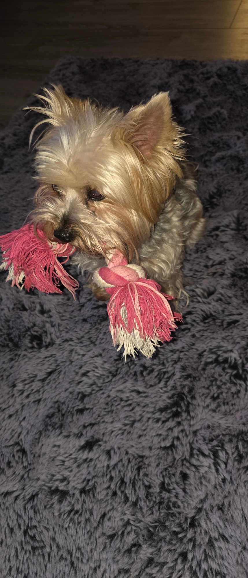 A small, tan and grey Yorkshire Terrier lies on a grey, shaggy rug, its head to the left. The dog has a pink and white knotted rope toy in its mouth. To the left of the rug is a light brown wooden flo…read more