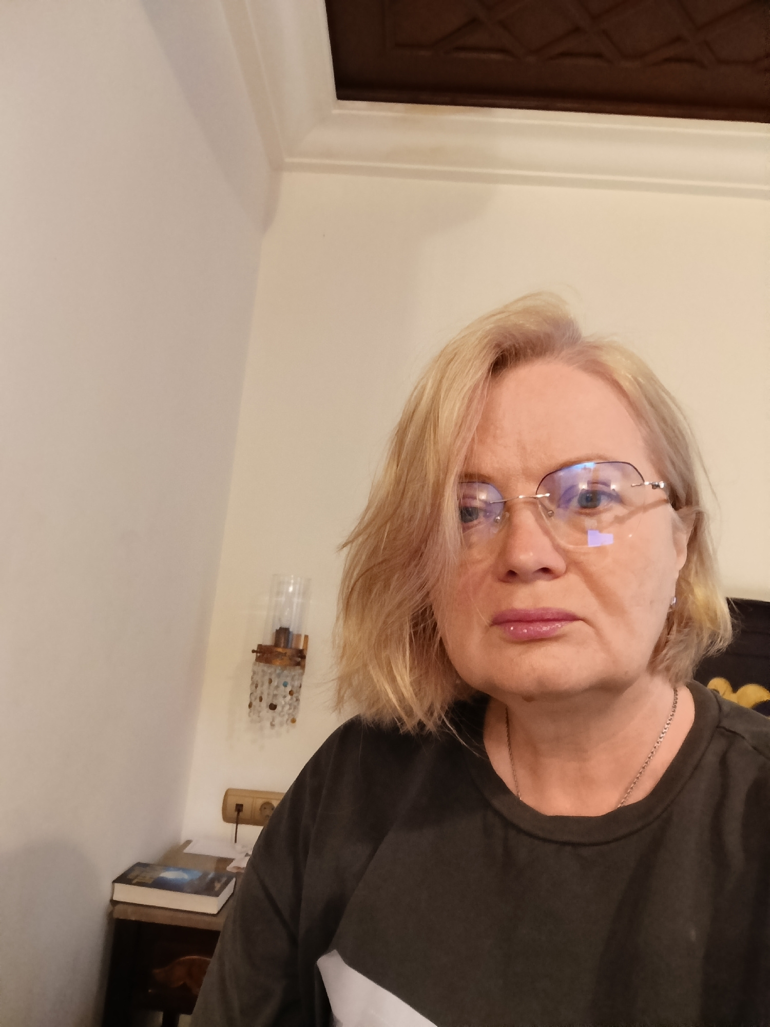 The image is a selfie of a blonde woman wearing glasses and a dark t-shirt with a white design. She is wearing a silver chain necklace. The woman is indoors with off-white walls. Behind her to the lef…read more