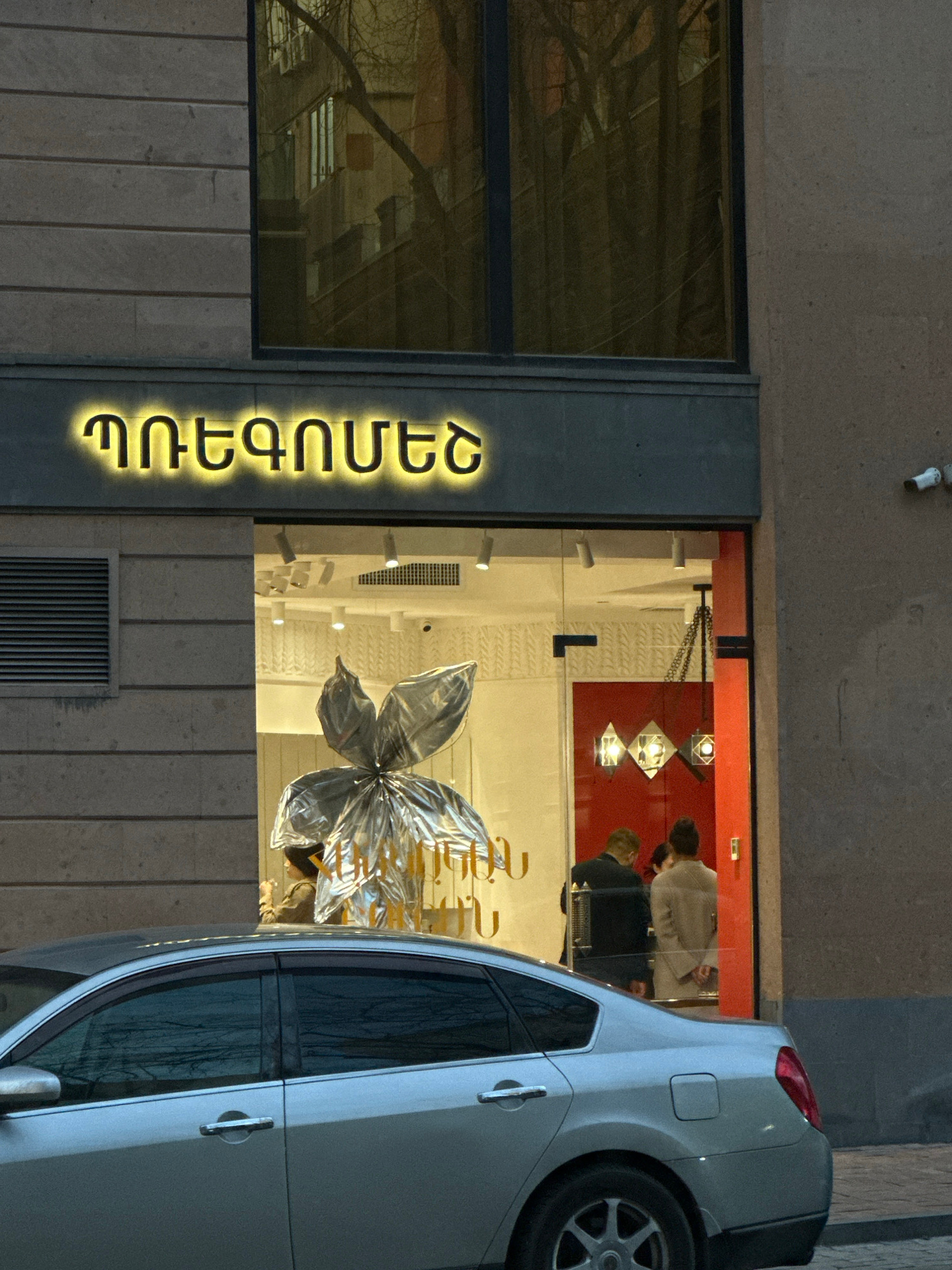 The image shows the storefront of a building in Yerevan, Armenia. The building has a sign with Armenian text illuminated in gold. Through the window, there's a silver decorative butterfly. Two people…read more